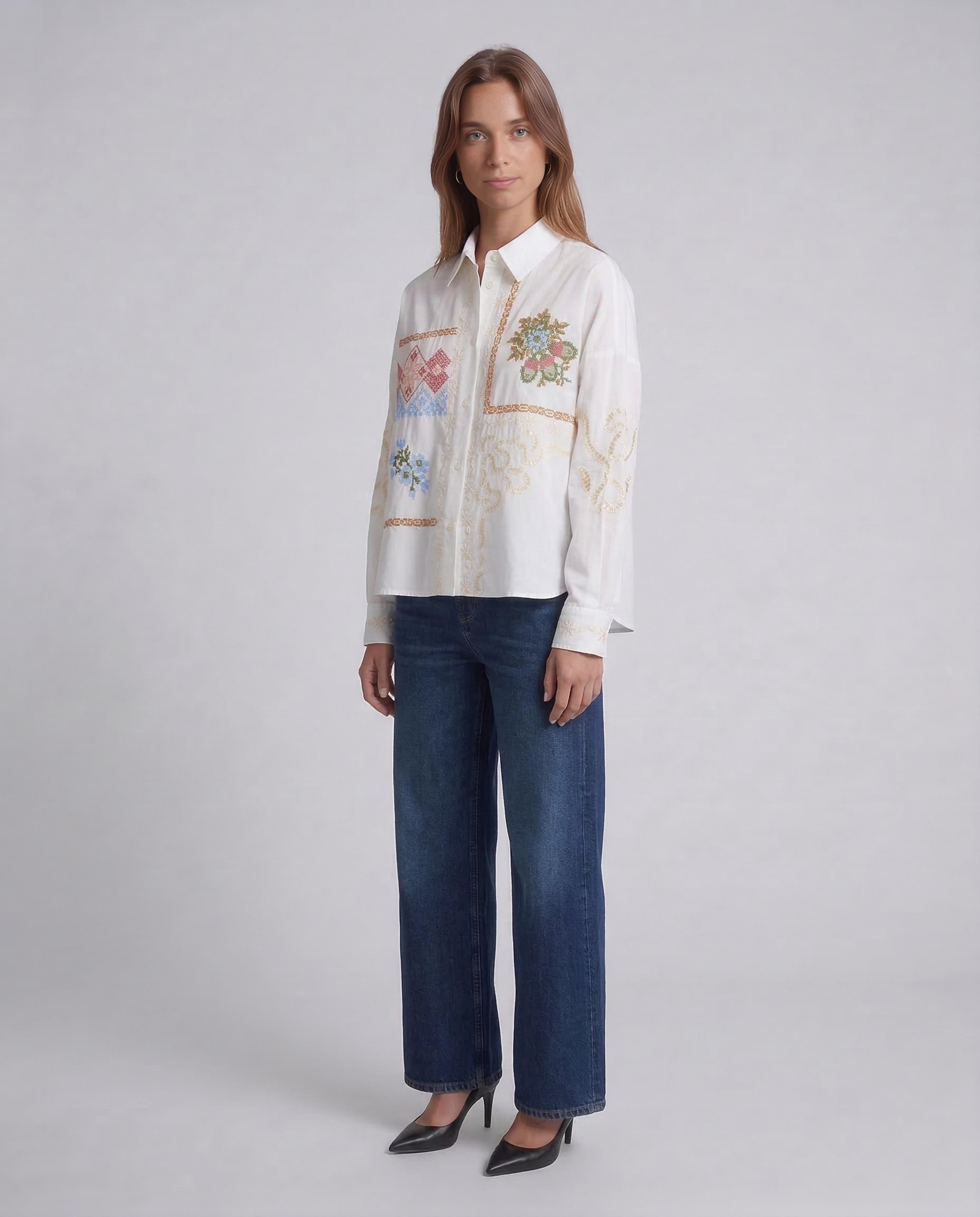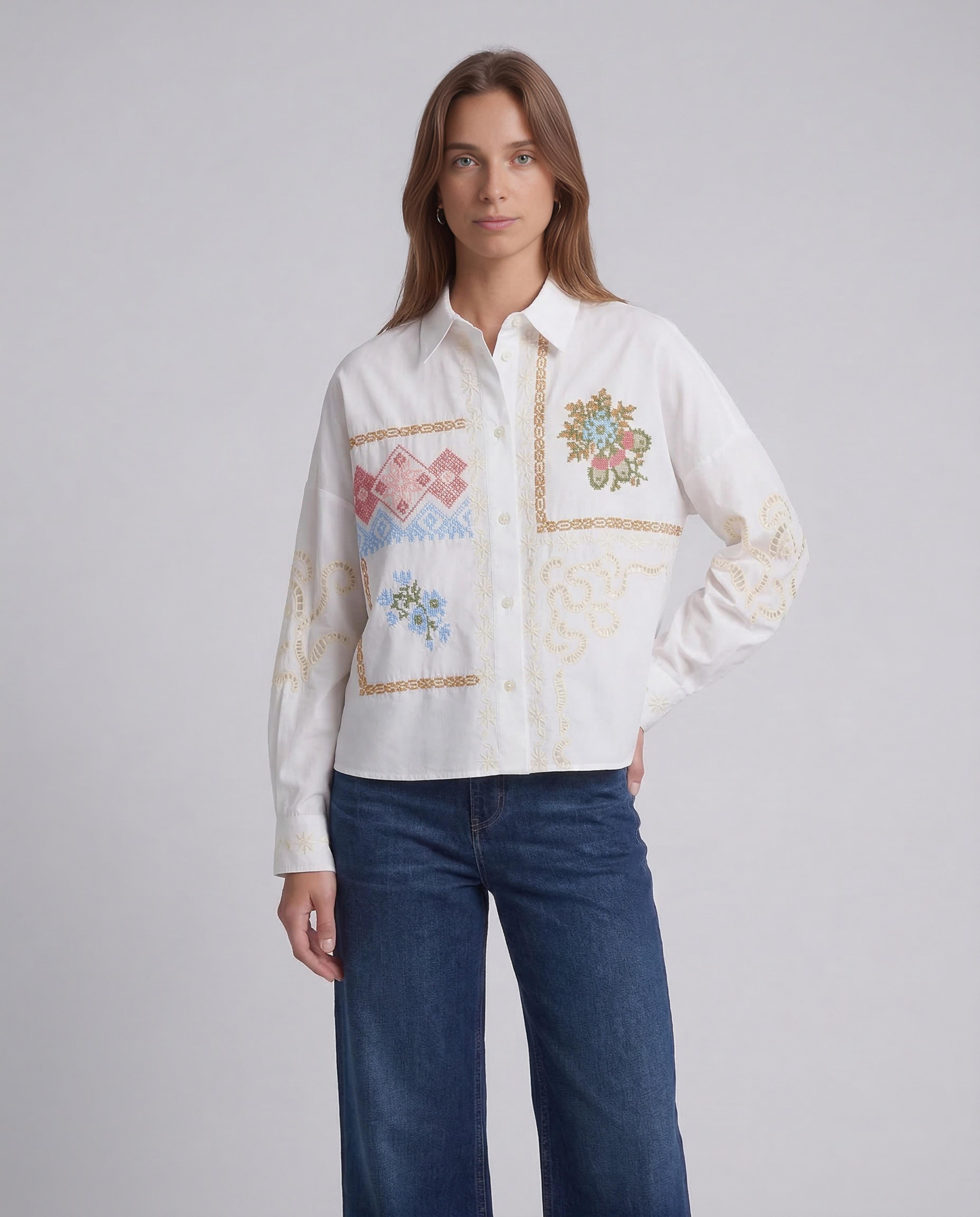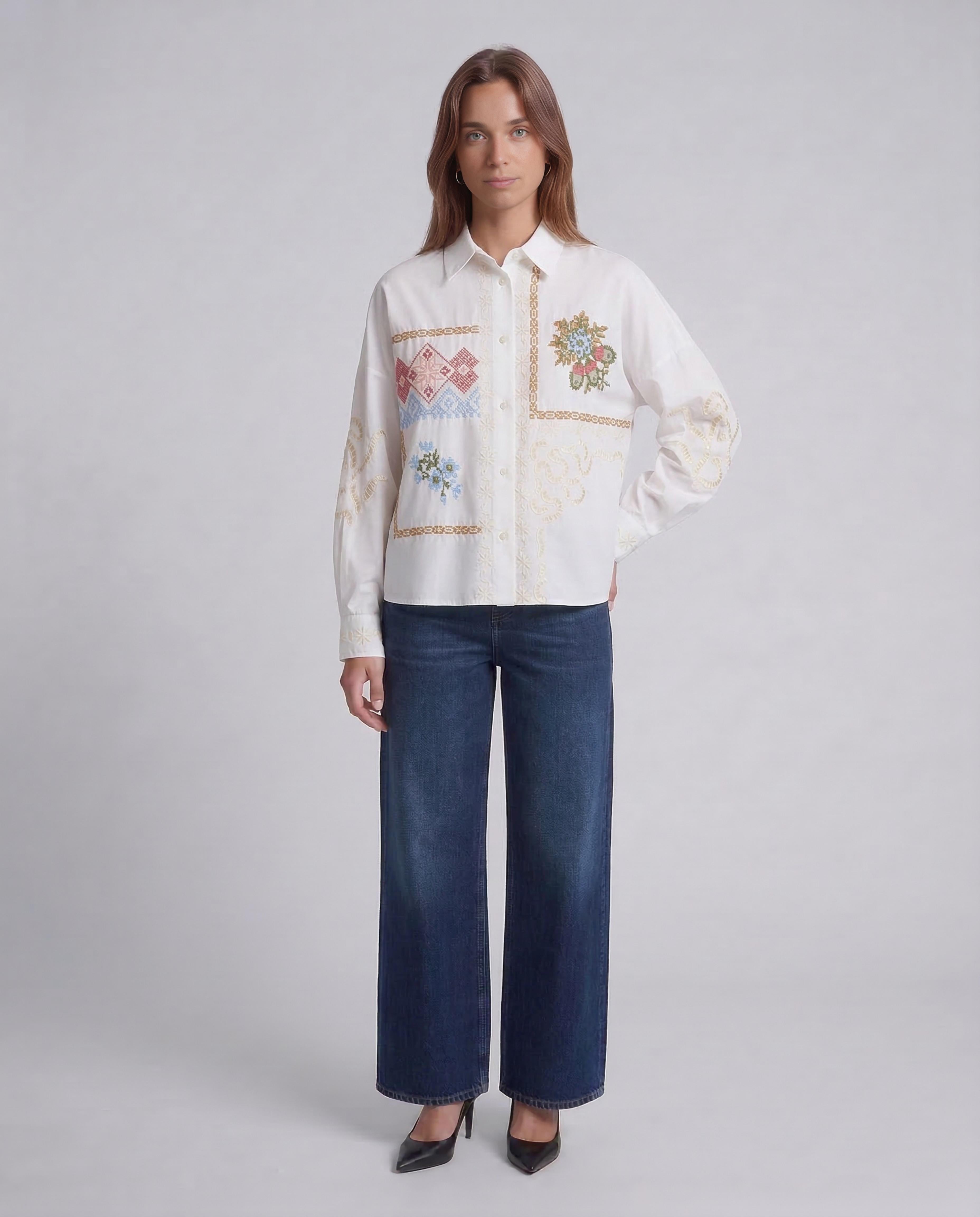 Un capo dal fascino sartoriale, questa camicia firmata Weekend Max Mara esalta la purezza del cotone popeline con dettagli ricercati. Il design cropped e la vestibilità boxy le conferiscono un'allure contemporanea e rilassata, perfetta per creare look sofisticati ma versatili. I ricami floreali a punto croce e gli inserti in pizzo traforato aggiungono un tocco romantico e distintivo, celebrando una femminilità moderna e attenta ai dettagli. Un pezzo iconico che riflette l'eleganza disinvolta del brand.Composizione: Tessuto 100% cotone; filo ricamo 100% poliestere.Vestibilità: BoxyCodice: WKDFONTE - 001