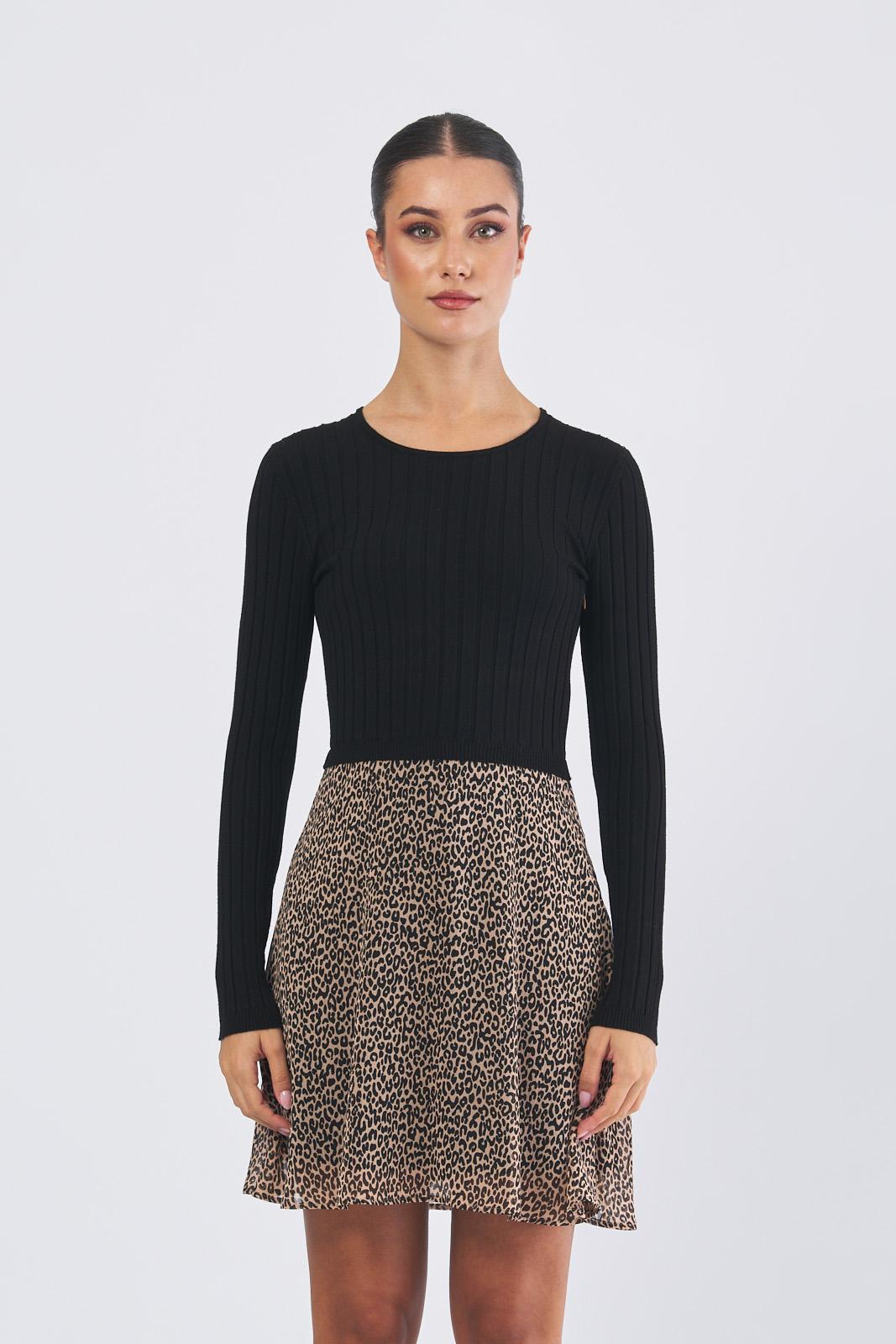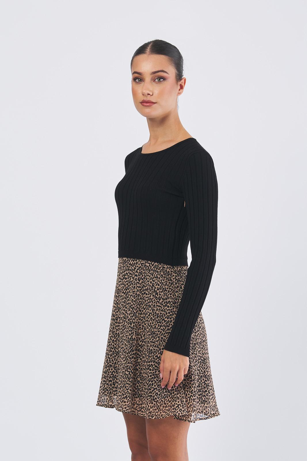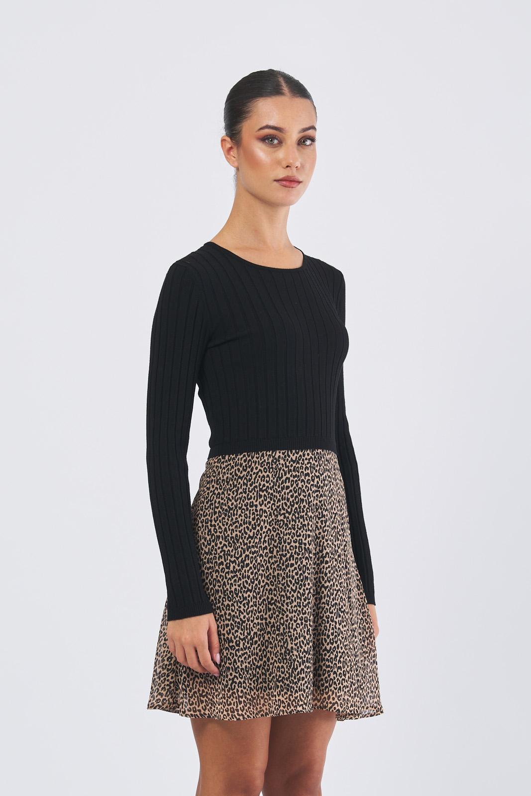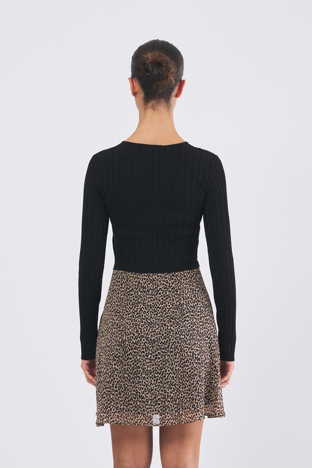Abito nero con gonna maculata con tessuto principale contenente una percentuale di poliestere riciclato superiore al 50%Top aderente in maglia stretch a coste piatteGonna svasata in crépon stampatoScollo tondo, maniche lungheZip invisibile al fiancoGonna foderata in jersey