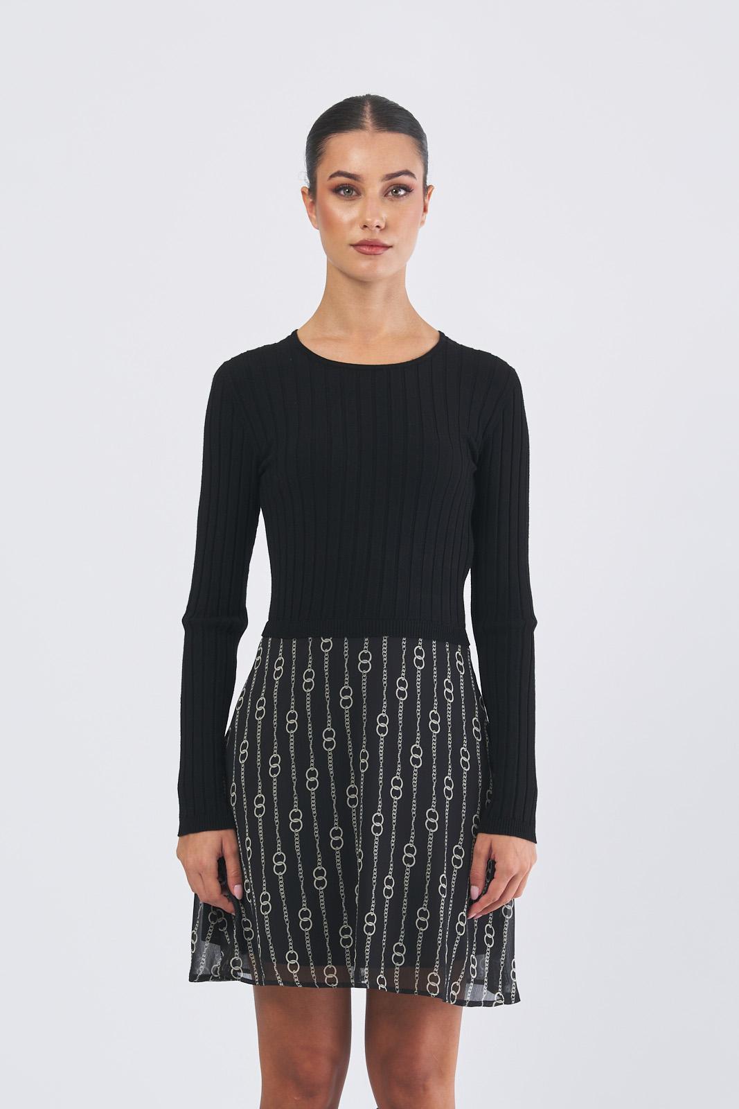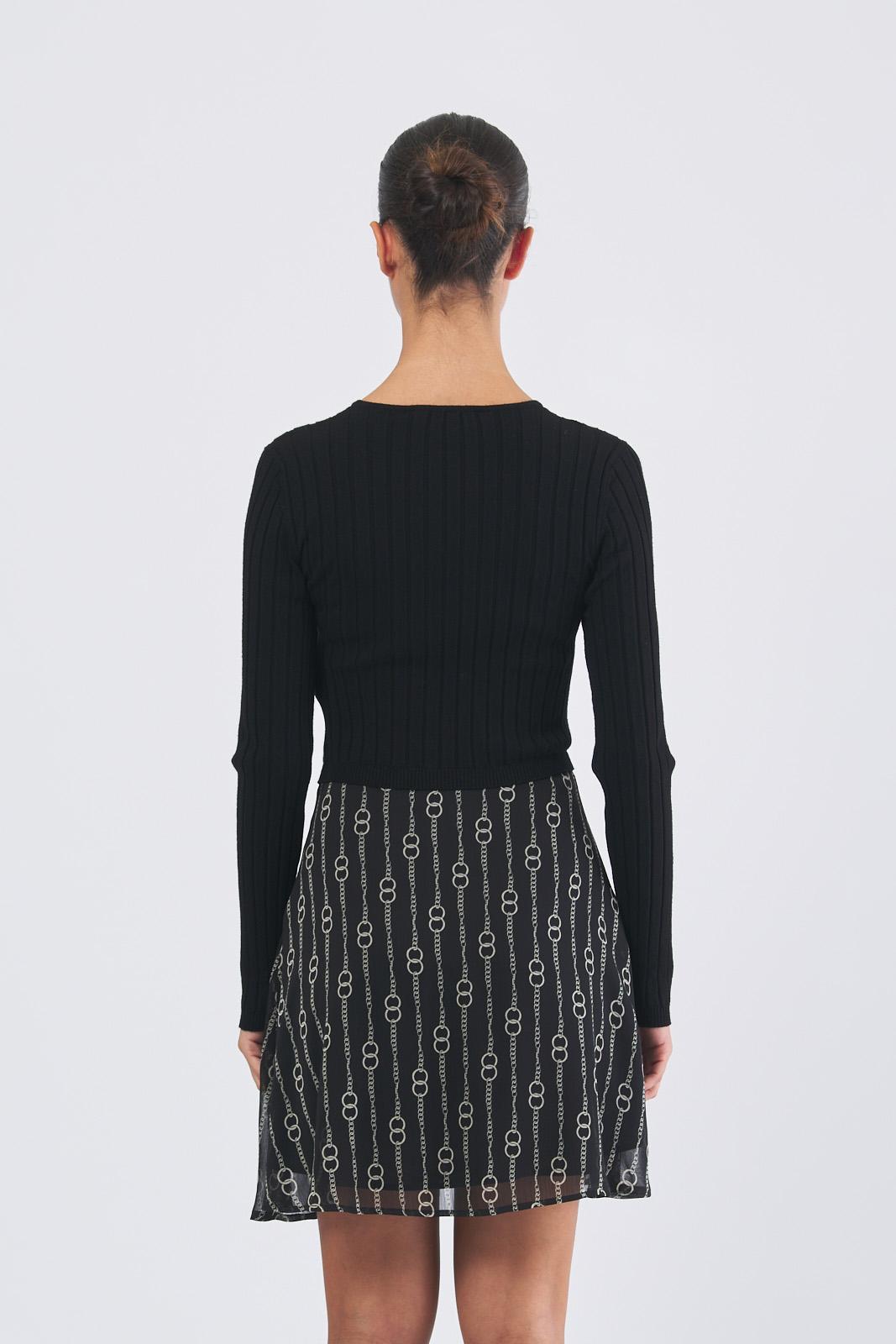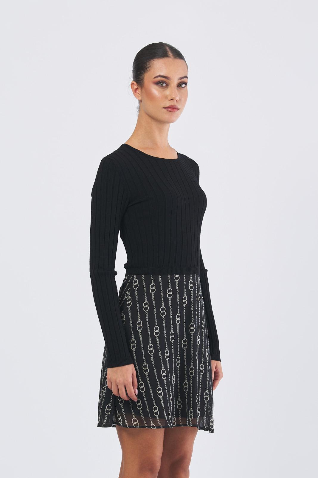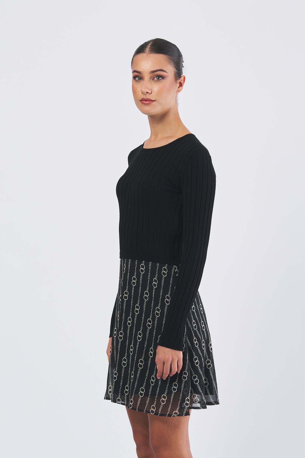 Abito nero con gonna fondo catena; tessuto principale contenente una percentuale di poliestere riciclato superiore al 50%Top aderente in maglia stretch a coste piatteGonna svasata in crépon stampatoScollo tondo, maniche lungheZip invisibile al fiancoGonna foderata in jersey