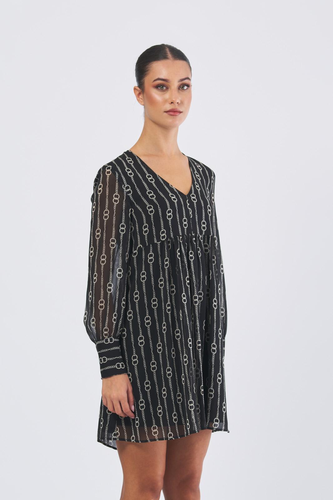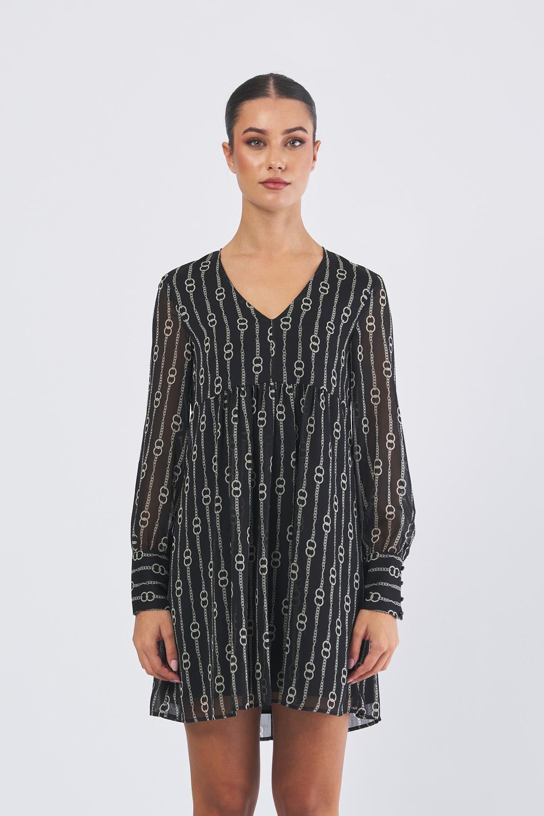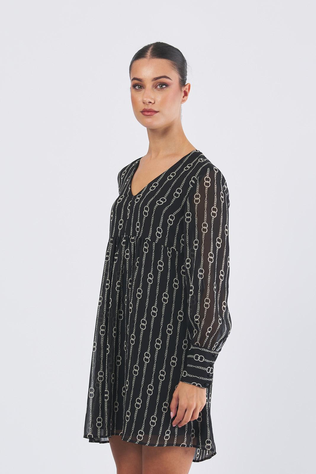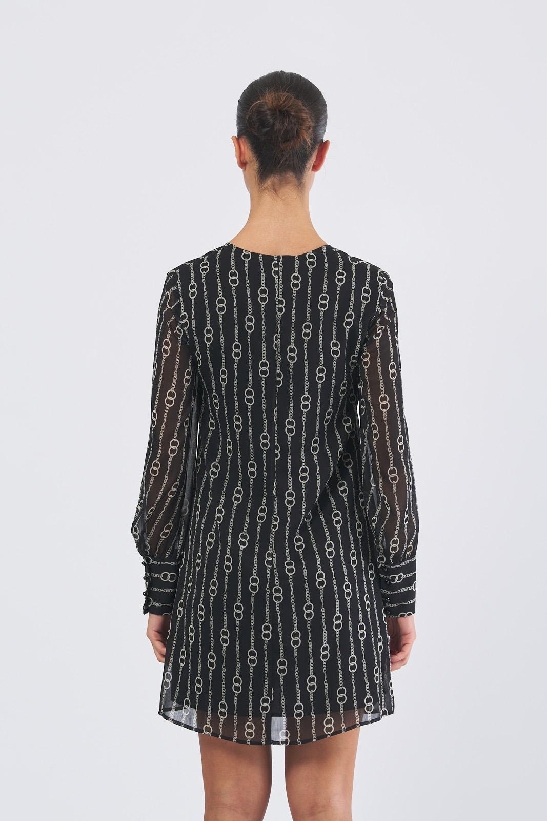 Abito nero con crépon stampatoLinee morbideTaglio sotto al seno con arricciatura centrale sul davantiScollo a V, maniche lunghe, polsi alti con bottoncini a bouleCapo foderato, maniche sfoderate