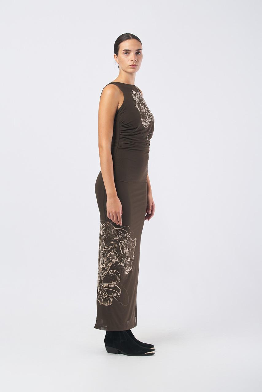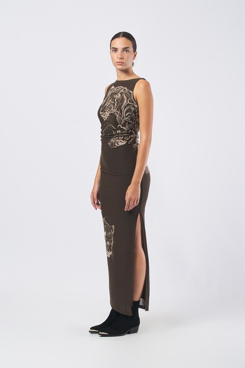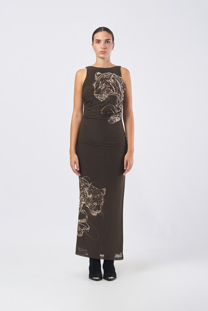 Abito color marrone girocollo con stampa tigre
