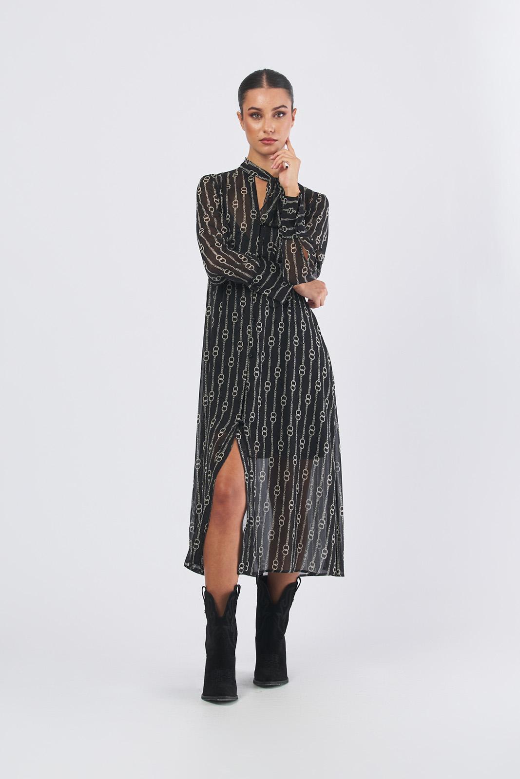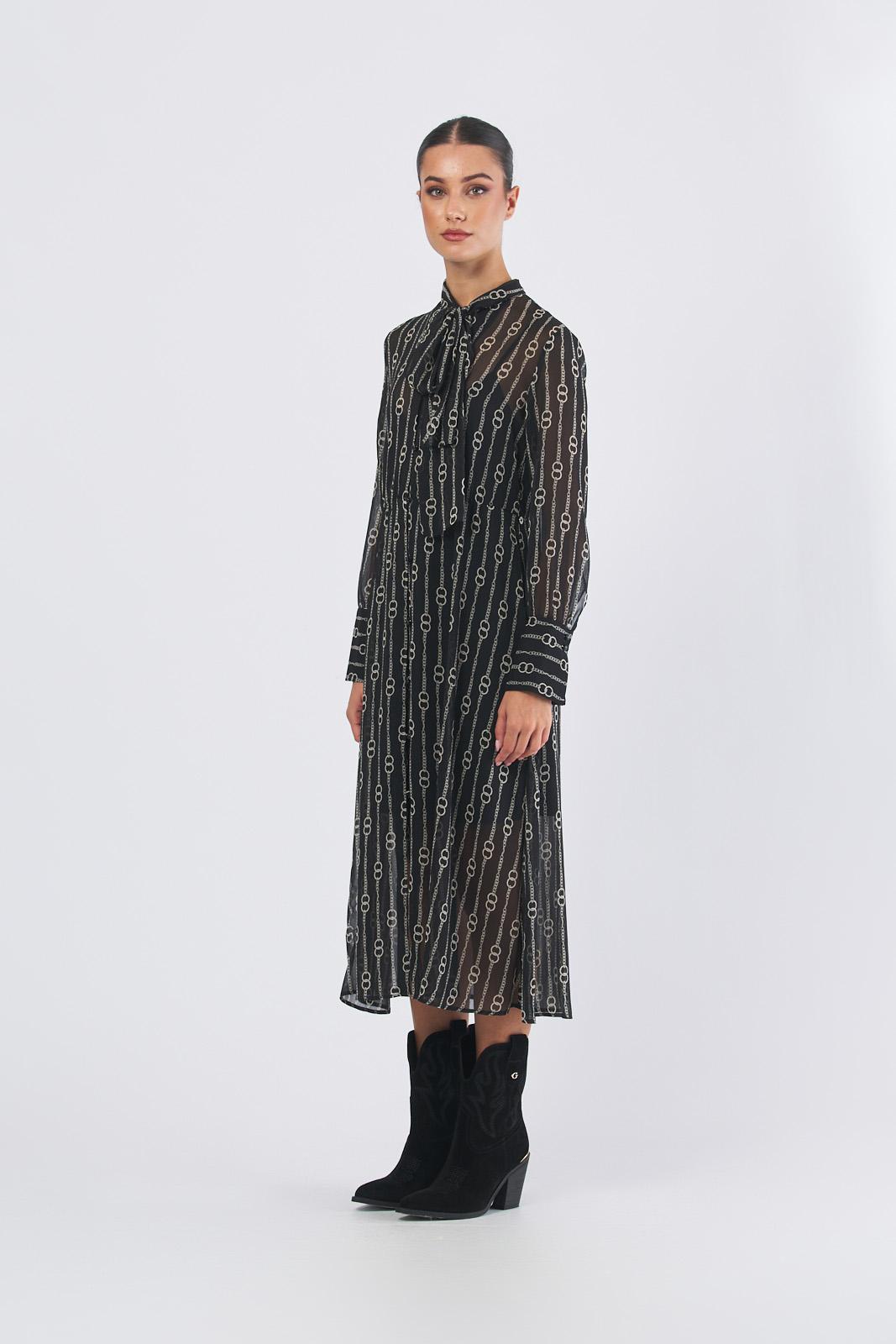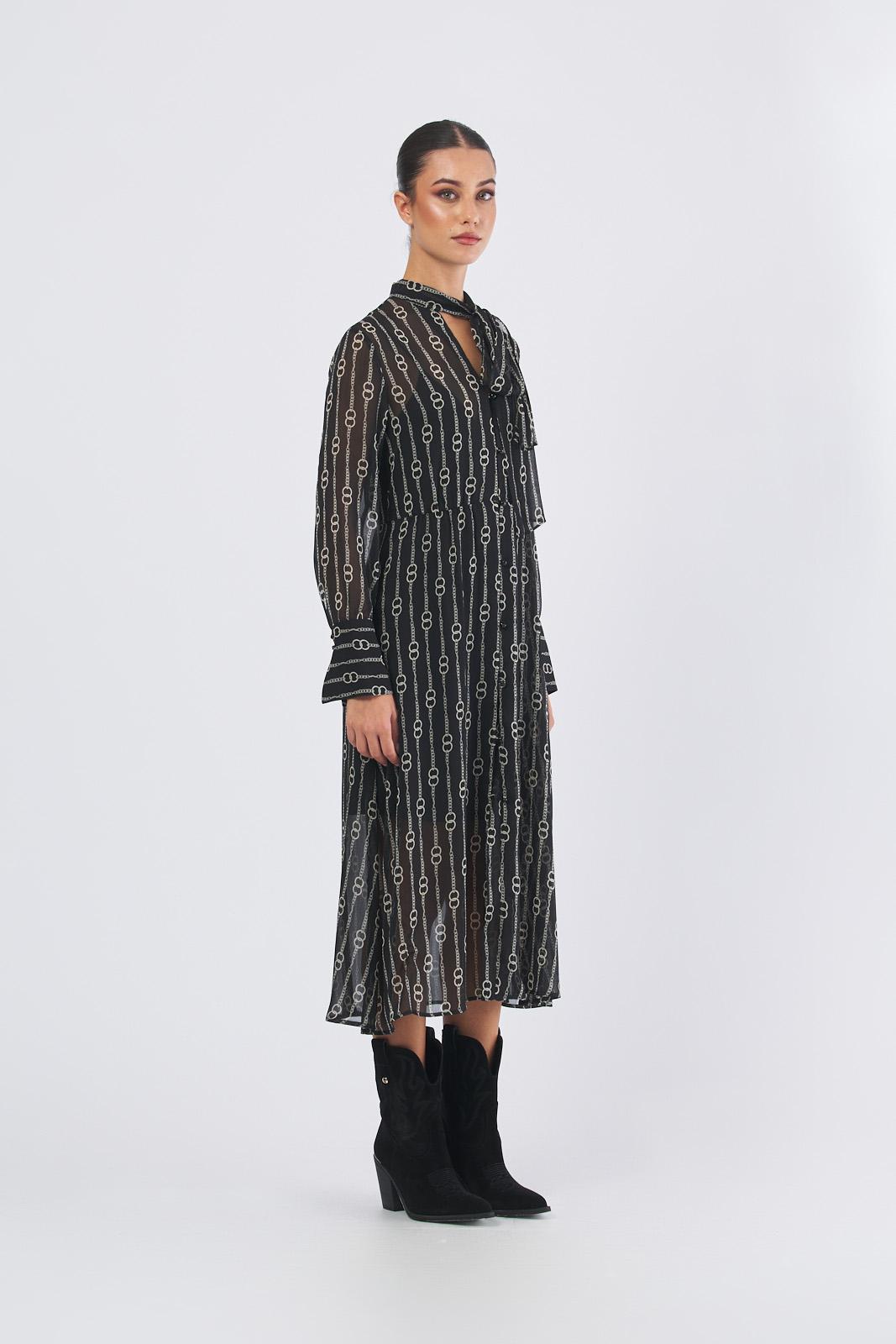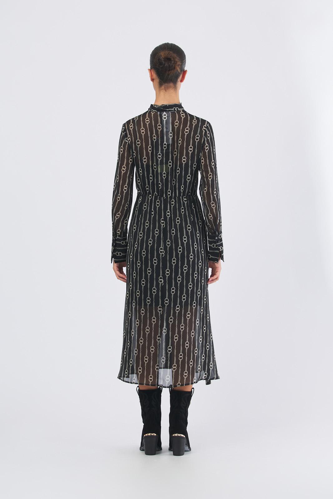Abito nero con fondo catena con tessuto principale contenente una percentuale di poliestere riciclato superiore al 50%Crépon stampatoTop morbido, gonna leggermente svasataVita delineata con arricciaturaCollo a foulard e scollo a V, polsi altiChiusura con bottoncini a boule sul davanti e ai polsiSottoveste in jersey