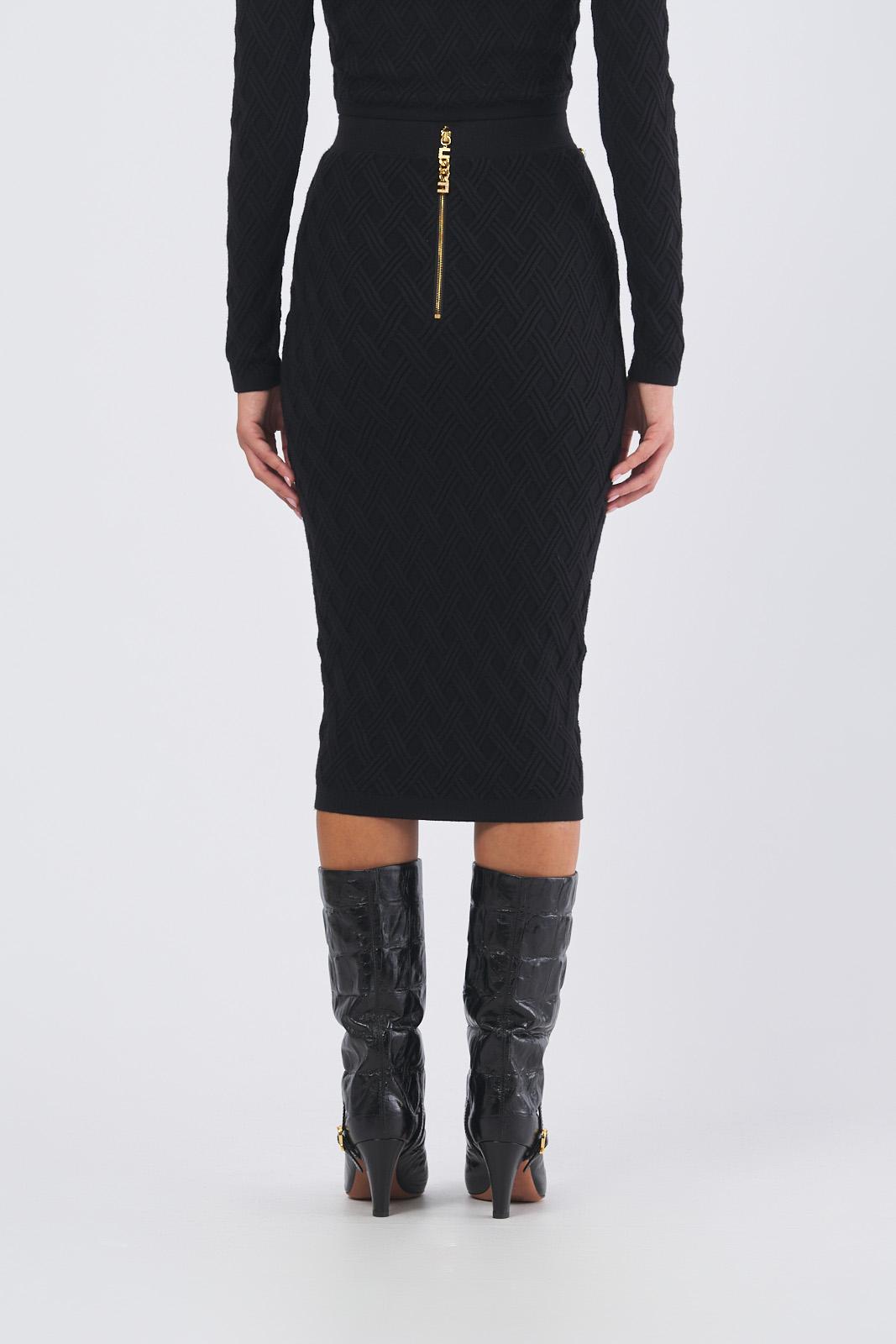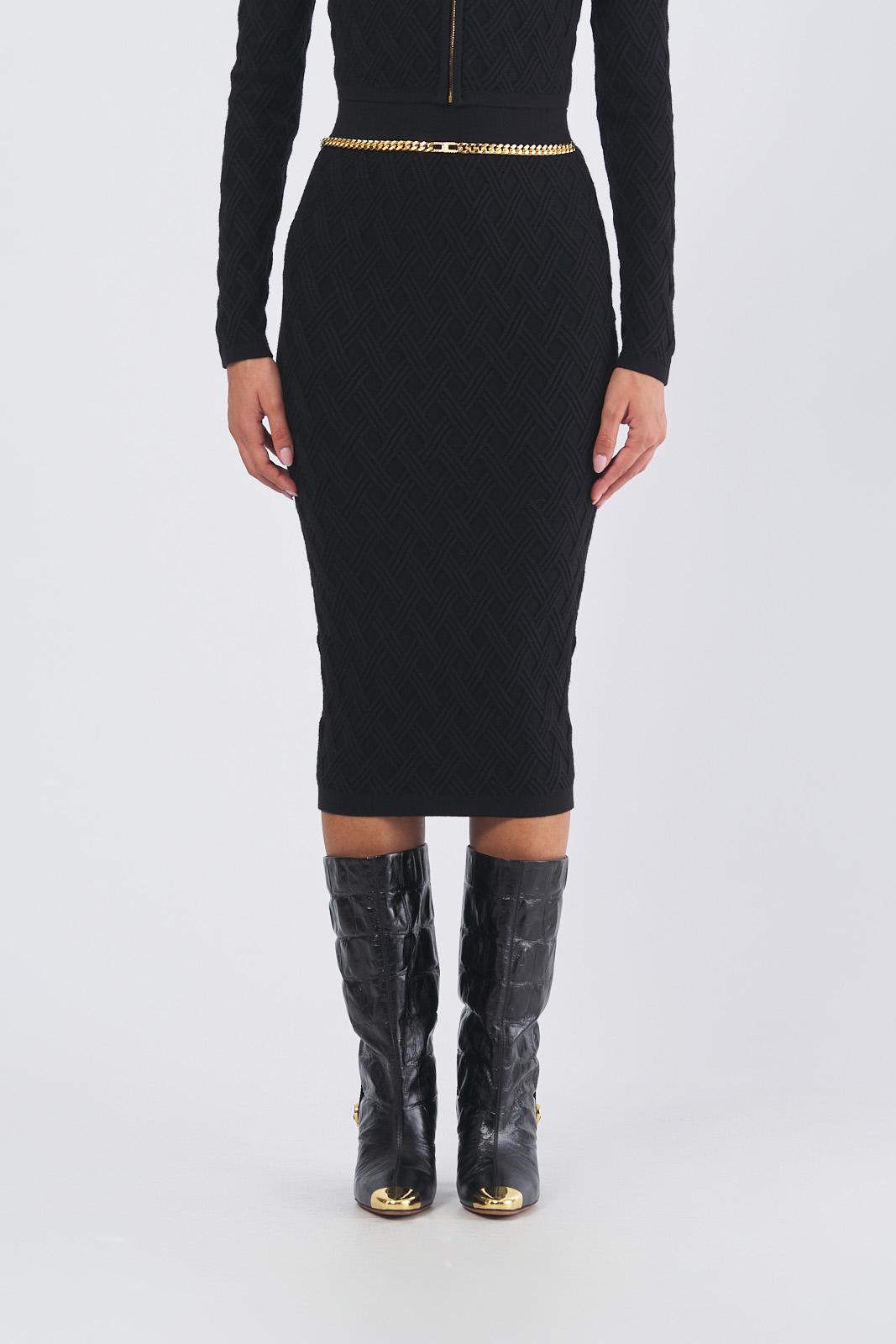 Gonna nera a tubo in maglia dalla vestibilità aderente. Con vita alta, si distingue per l'elaborata lavorazione 3D che crea un disegno geometrico a rombi su tutta la lunghezza. Impreziosita dalla catena diamantata con logo e strass che decora il punto vita.