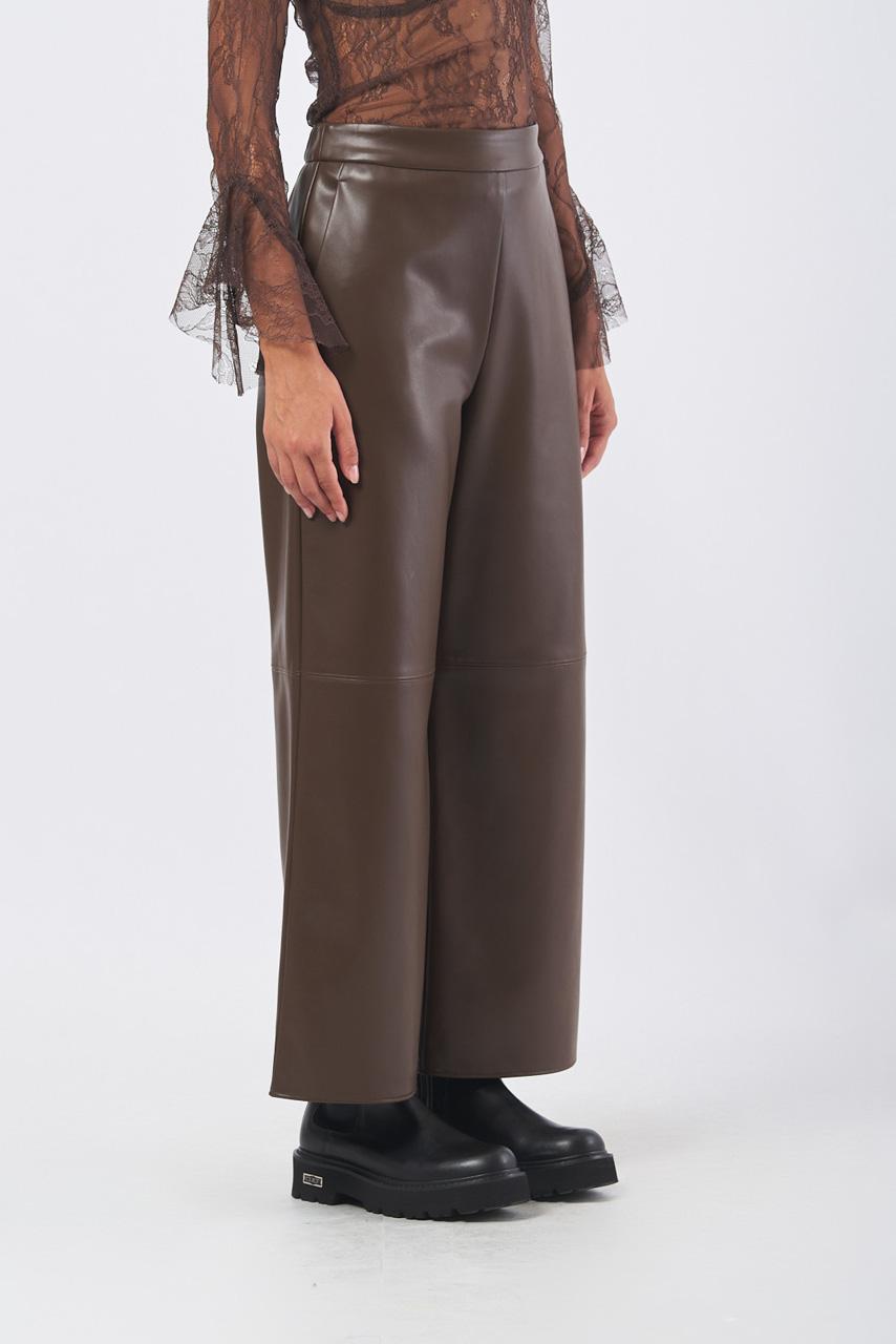 Pantalone marrone in morbido tessuto spalmatoVestibilità morbida con gamba drittaVita elasticizzata sul retroTasche alla francese sui fianchiElastico logato interno