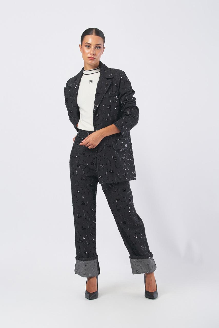 Pantalone nero realizzato in tela di jeans decorata con paillettes presentano una gamba ampia, vestibilità morbida e costruzione a cinque tasche. La chiusura è affidata a un bottone singolo effetto vintage con zip nascosta..