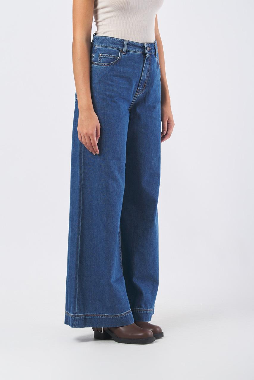 Jeans 5 tasche dalla vestibilità morbida con gamba larga.Tessuto principale di cotone proveniente da agricoltura biologicaJeans in denim di puro cotone trattato in capoChiusura con zip coperta e bottone a chiodoImpuntura alta al fondoRivetti in metallo e cuciture a contrasto