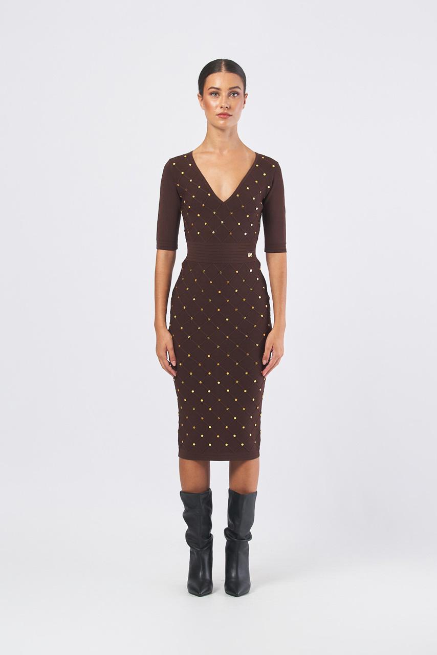 Fitted coffee-colored knit dress. The dress features a V-neck and elbow-length sleeves. It stands out for its elaborate diamond pattern with raised ribbing, embellished with gold-tone metal buttons that add a touch of sparkle. The zipper with a jeweled pull on the back completes the look.