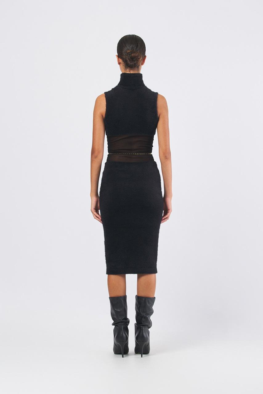 Black knitted dress with a fitted fit. The sleeveless dress features a turtleneck and a pencil skirt. It stands out for its unique workmanship, which creates a soft, fur-like texture and the sheer effect of the brushed fabric at the waist. The chain belt with logo adds a touch of sparkle.
