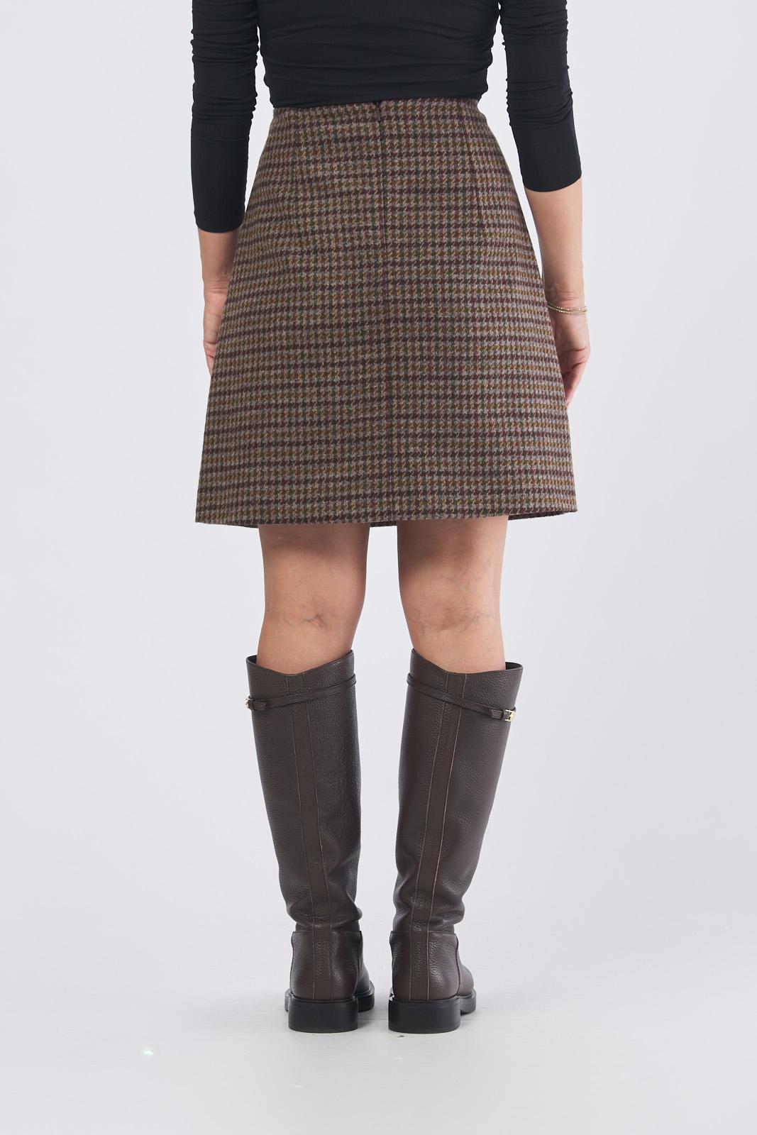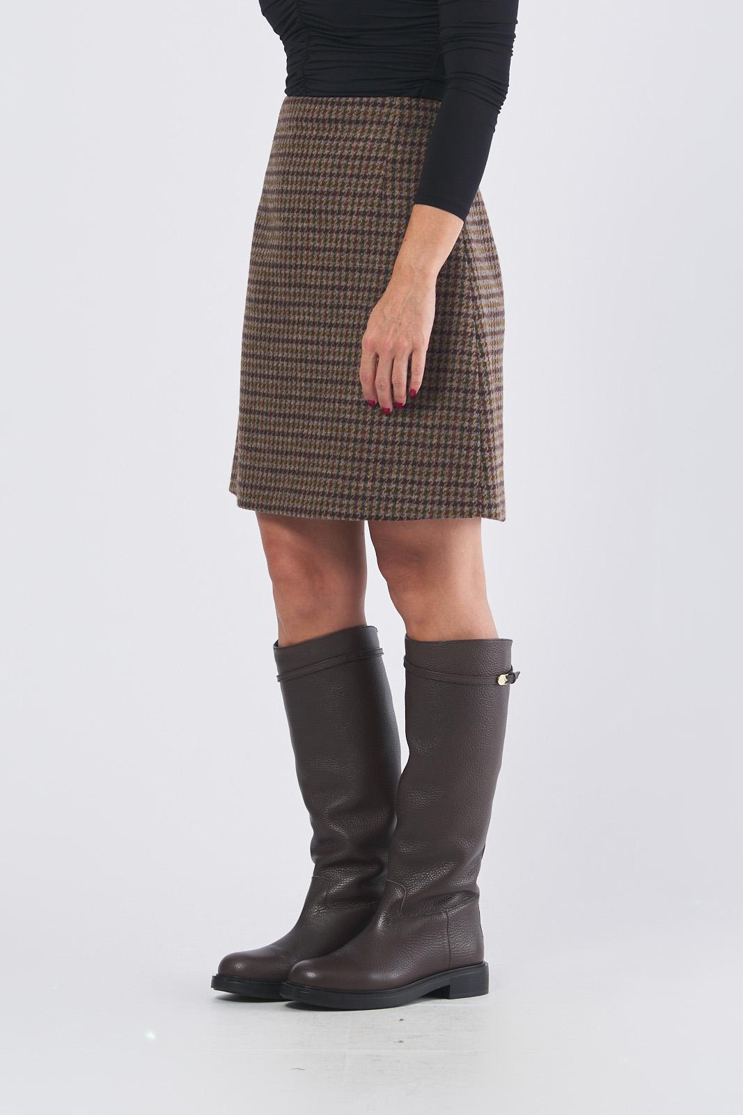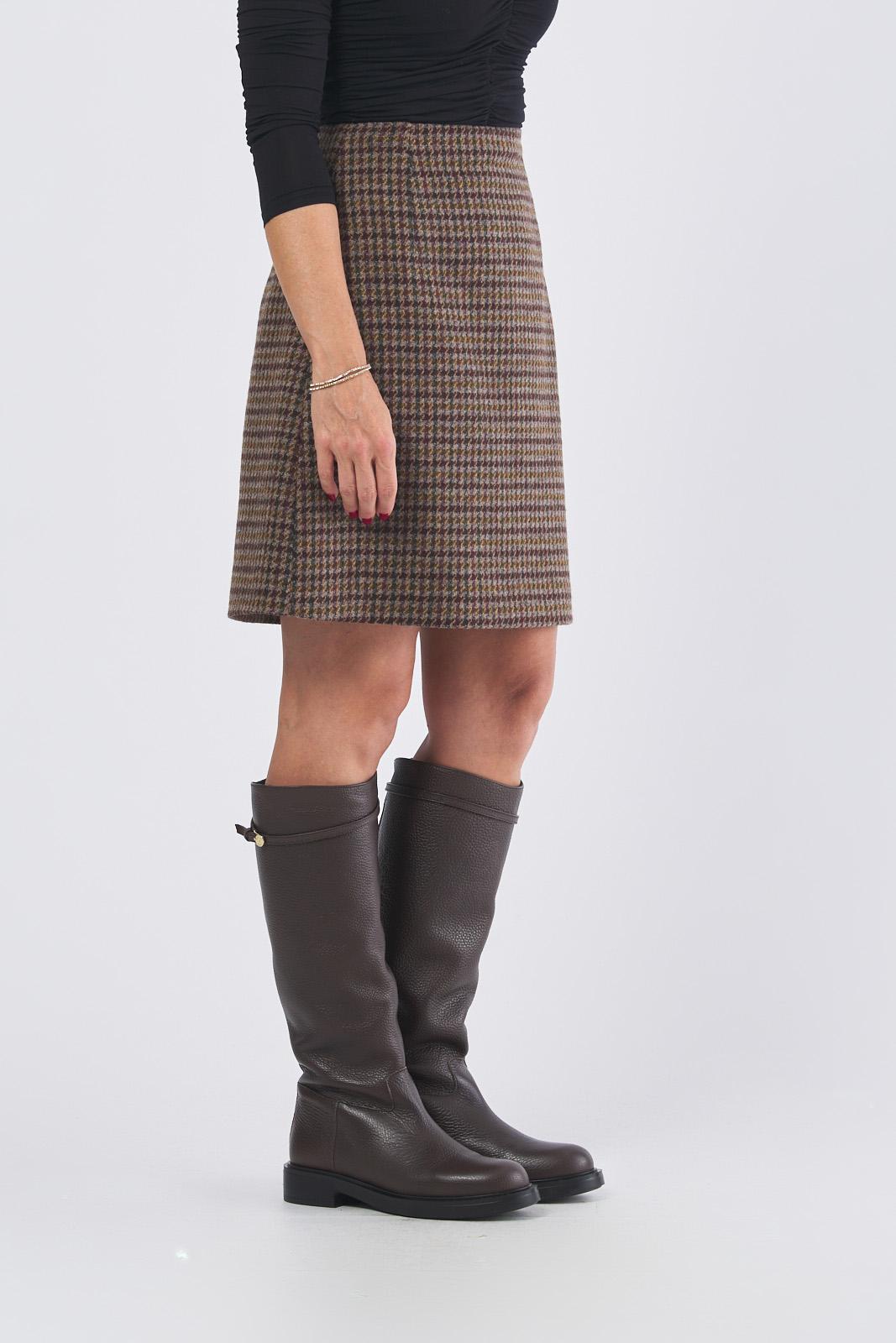 Gonna in tessuto in pura lana con finitura effetto shetlandLinea leggermente svasataChiusura con zip al centro sul retroPinces cucite in vita davanti e sul retroFoderata