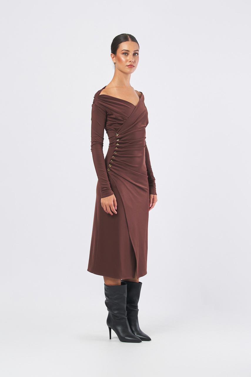 Coffee-colored jersey dress with a fitted fit. The dress has long sleeves and stands out for its asymmetrical neckline that flows into an elaborate side drape, held in place and embellished with gold metal buttons that create a three-dimensional effect. The side slit adds a bold finishing touch.