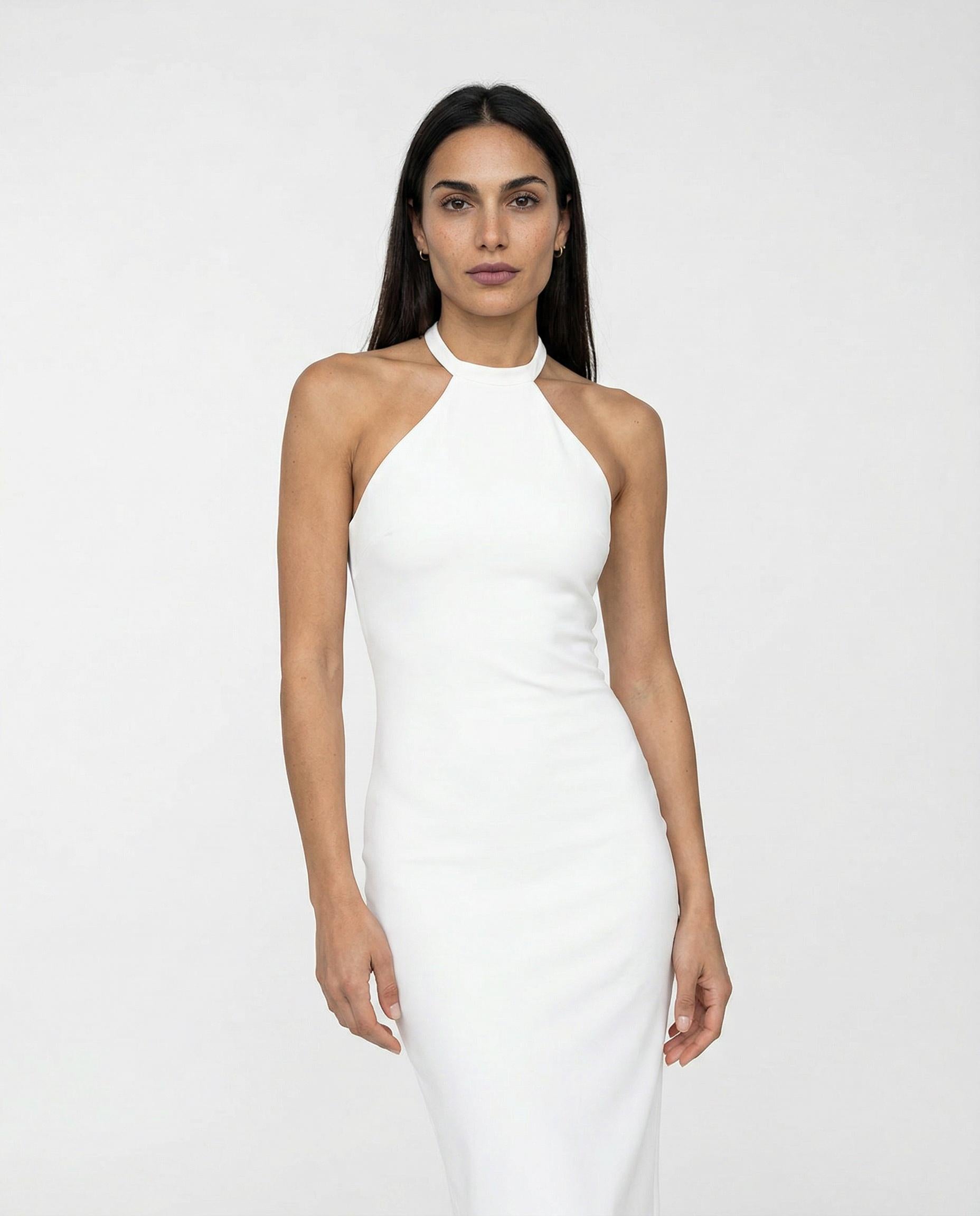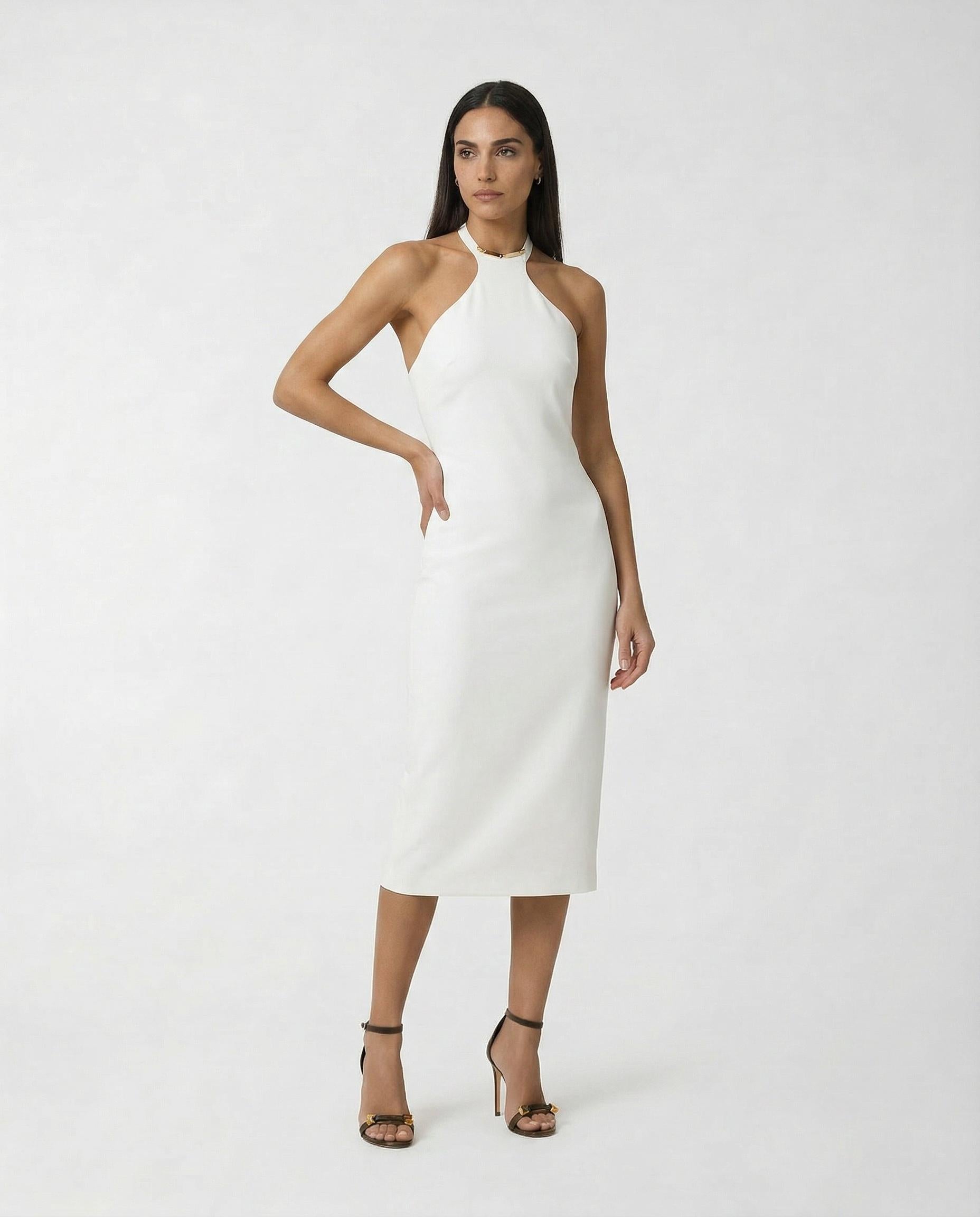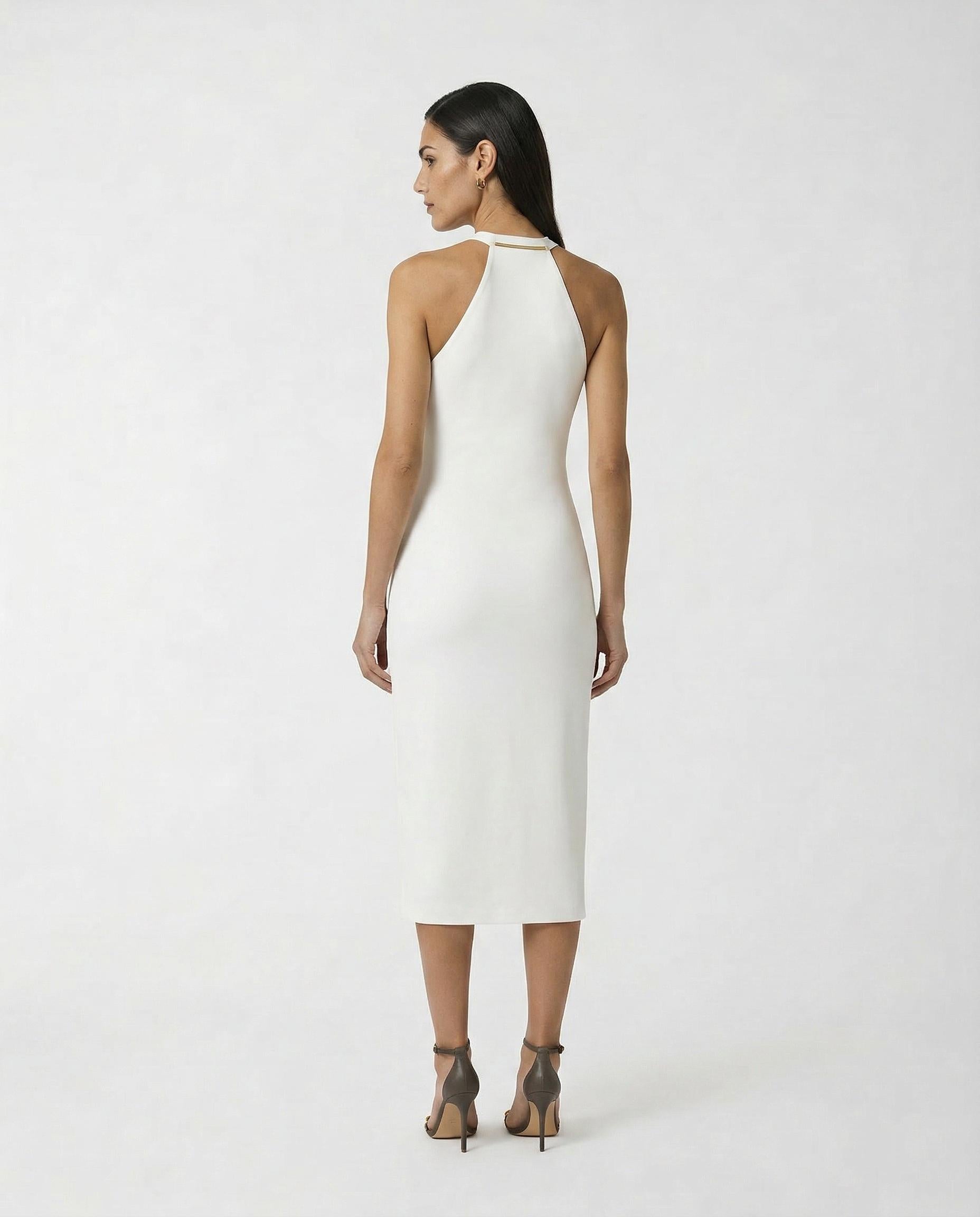 Un capo che celebra la figura con eleganza e raffinatezza. Questo abito firmato Elisabetta Franchi è disegnato per esaltare la silhouette grazie a una linea aderente che si apre in una fluida gonna di media lunghezza. Lo scollo olimpionico, impreziosito da una placca logo in metallo dorato, mette in risalto le spalle con un tocco distintivo e luminoso. Un design sofisticato, perfetto per chi cerca uno stile femminile e ricercato.Composizione: Crêpe leggeroVestibilità: AderenteColore: AvorioCodice: AB91761E2 360