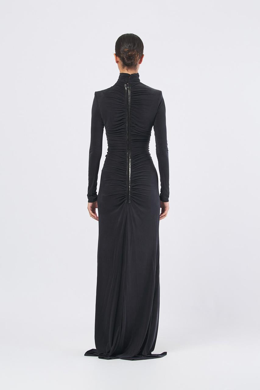 Abito da sera in jersey nero cupro dalla vestibilità aderente. Il vestito ha spalle strutturate, collo alto, maniche lunghe. Si distingue per i dettagli in camoscio con texture effetto pitone da cui si irradiano elaborati drappeggi e una coulisse con dettagli smaltati. La gonna con spacco laterale regala un'ultima nota audace.