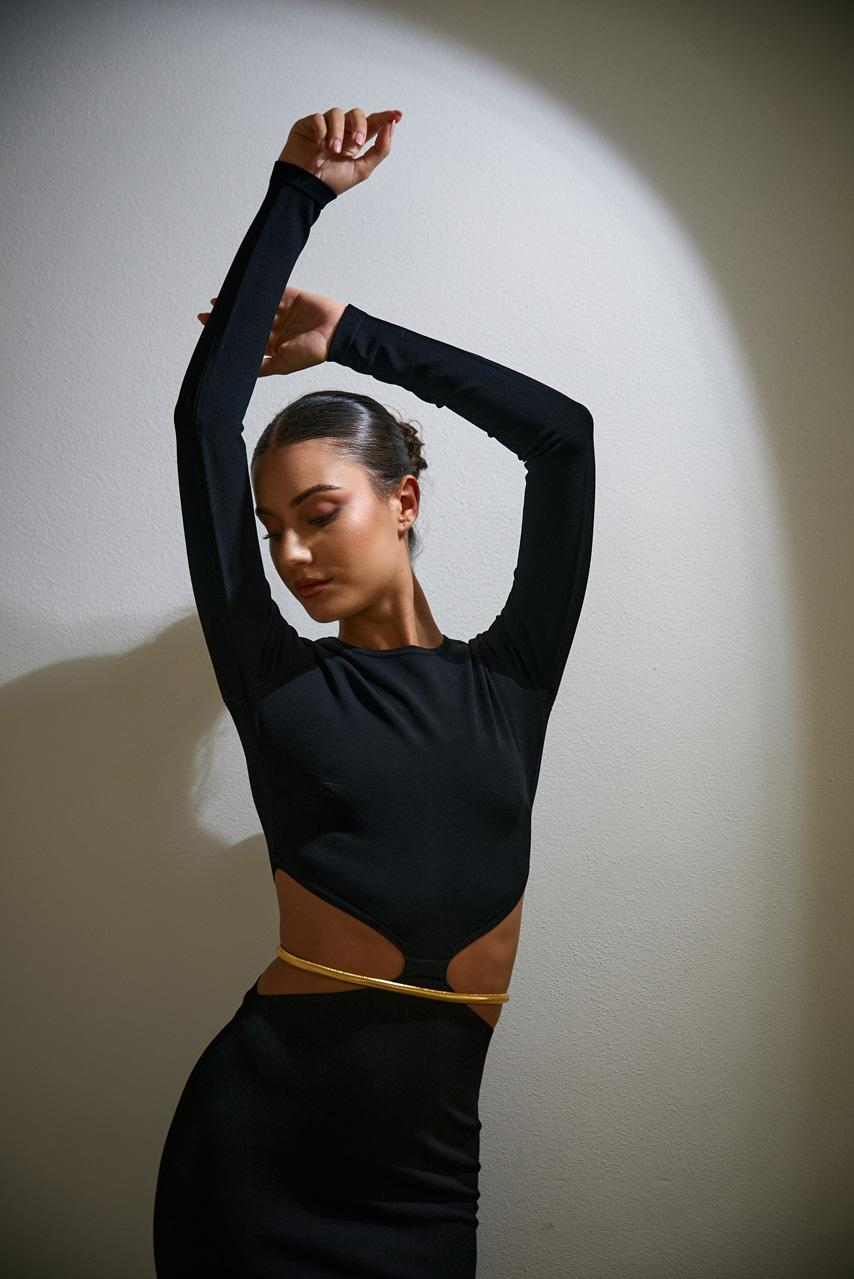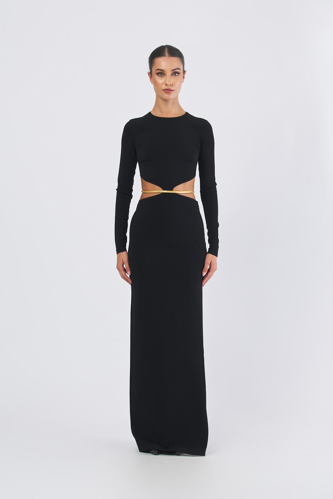 Abito nero da sera in maglia dalla vestibilità slim. Il vestito ha girocollo, maniche lunghe e si distingue per i tagli cut-out in vita che rivelano i fianchi, impreziositi dalla cintura in trama snake amovibile e flessibile per sperimentare più opzioni di styling.