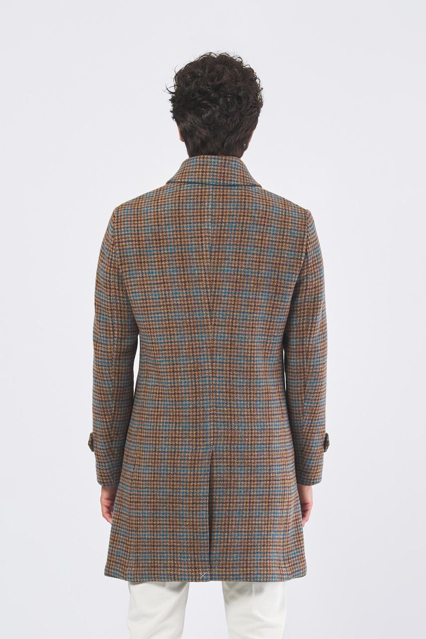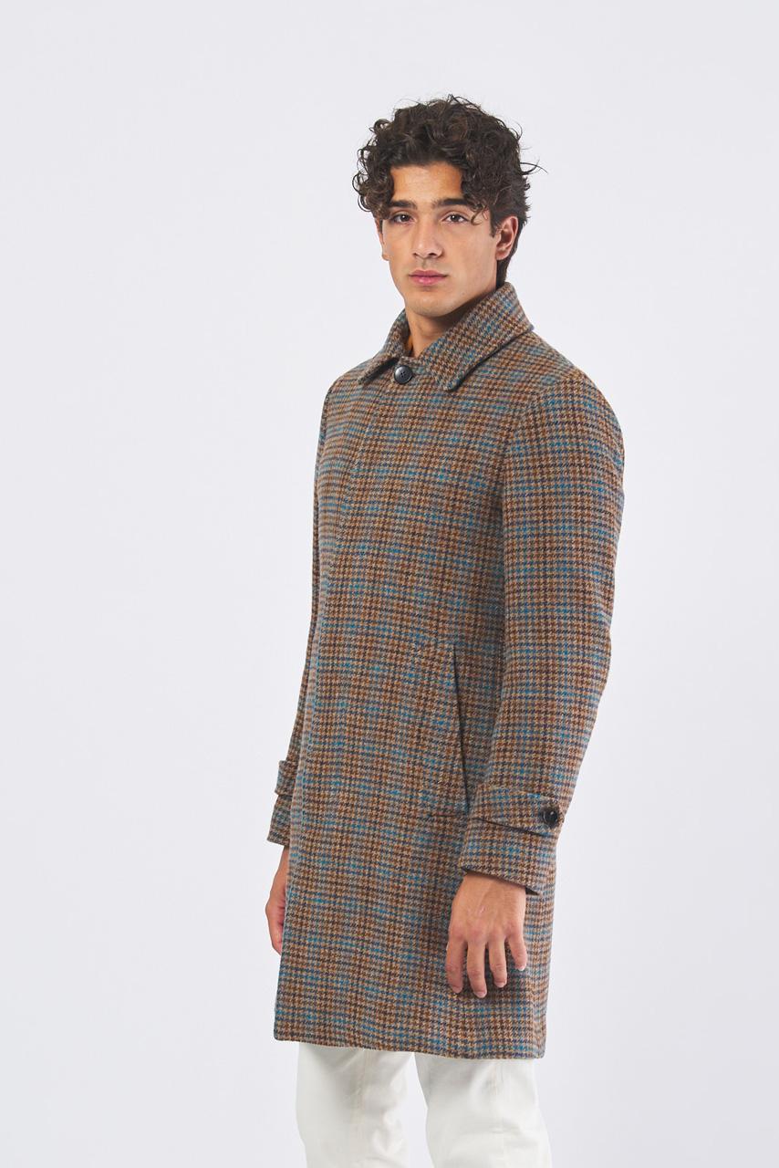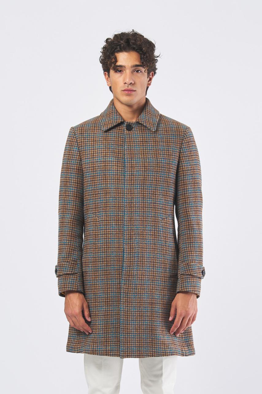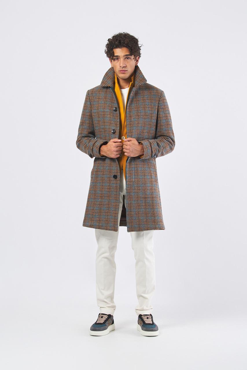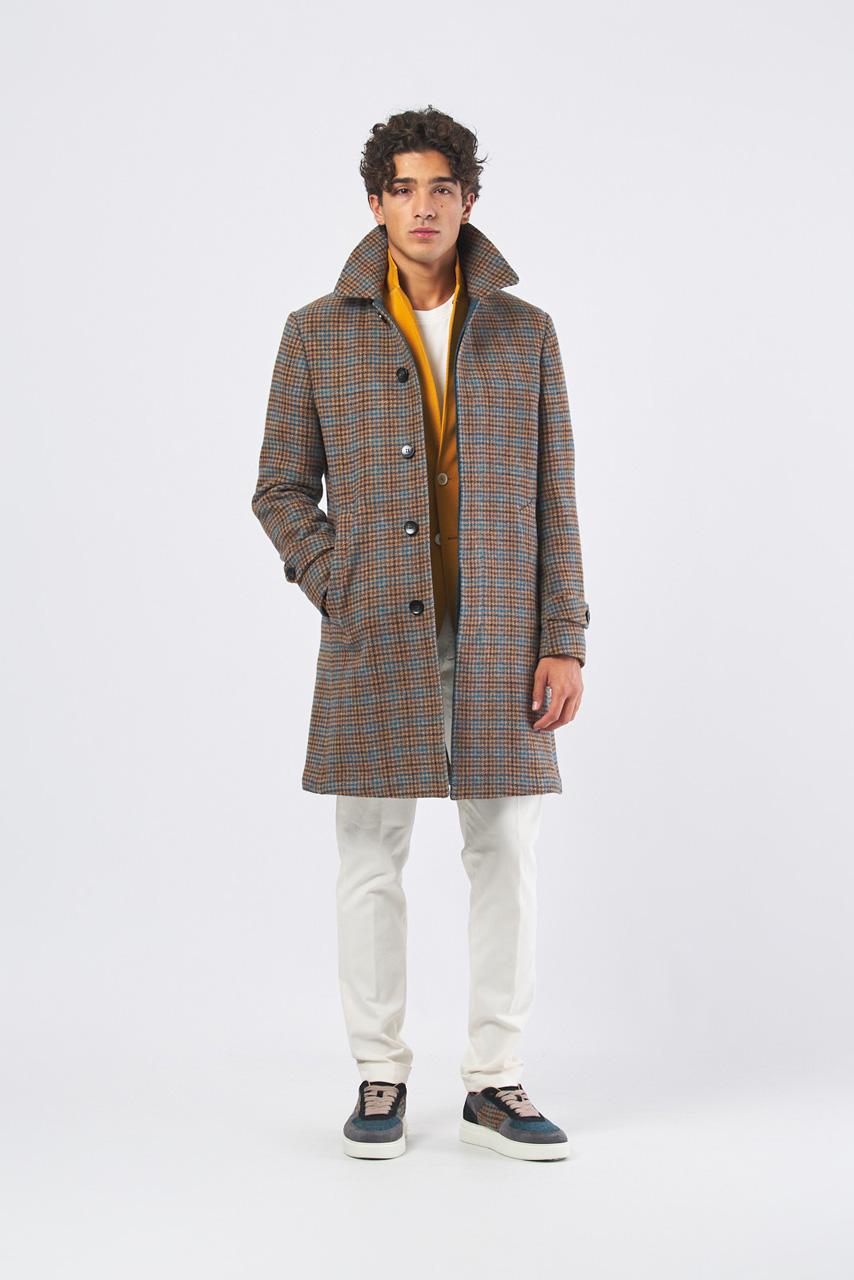 Cappotto lungo color cognac.Il modello presenta un colletto a camicia, alamari ai polsi, due tasche laterali, due tasche interne e uno spacco sul retro, ed è completato da una chiusura frontale nascosta con primo bottone visibile.