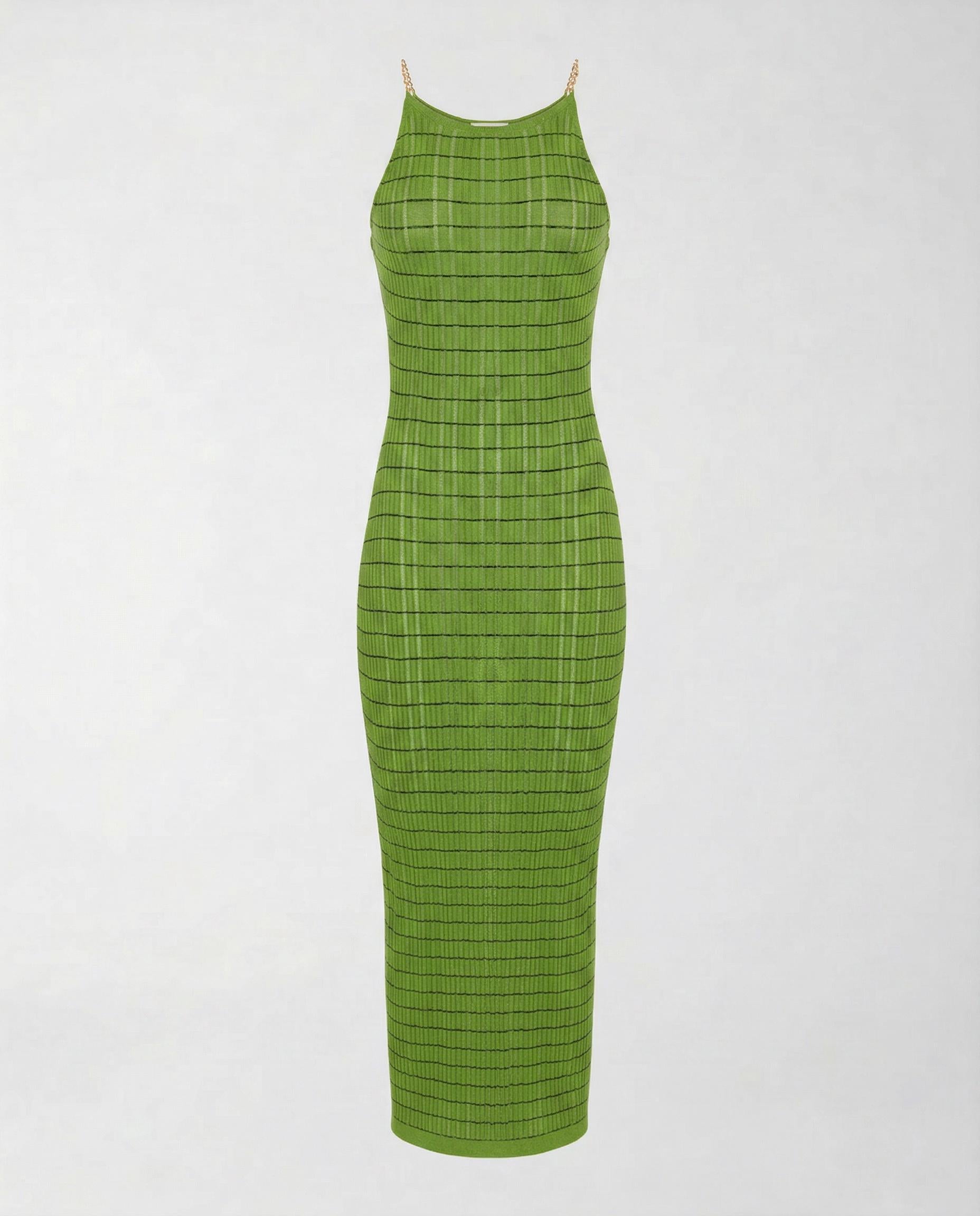 Un design sofisticato e contemporaneo per questo abito lungo in maglia dalla silhouette femminile e scultorea. Lo stile senza maniche è impreziosito da catene in metallo dorato che fungono da spalline, un dettaglio prezioso e distintivo che illumina il capo. La particolare lavorazione a maglia con effetto spugna crea una texture leggera e morbida, esaltata da una delicata fantasia a righe. Un capo pensato per valorizzare la figura con eleganza e carattere.Composizione: Maglia effetto spugnaVestibilità: AderenteColore: Cacao/AvorioCodice: AM29Q62E2 FA1