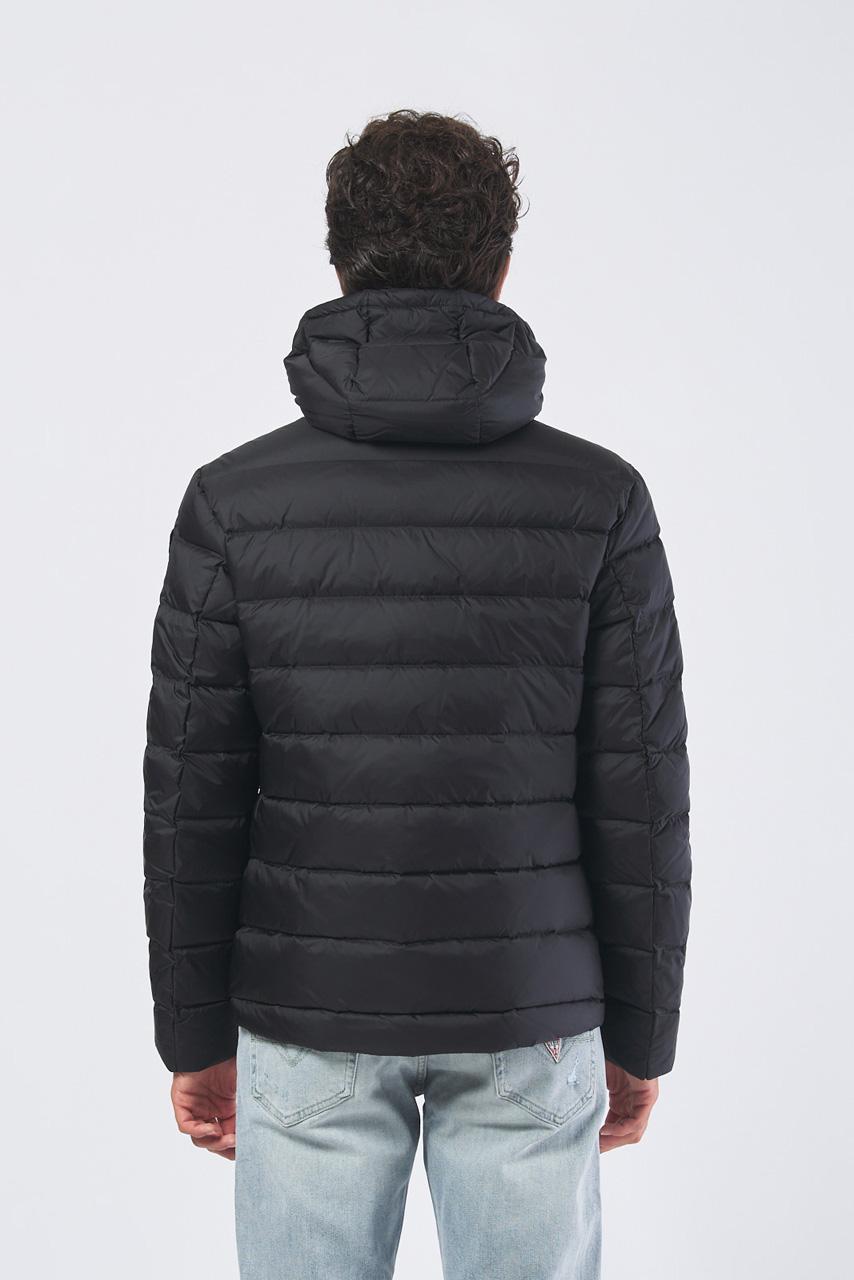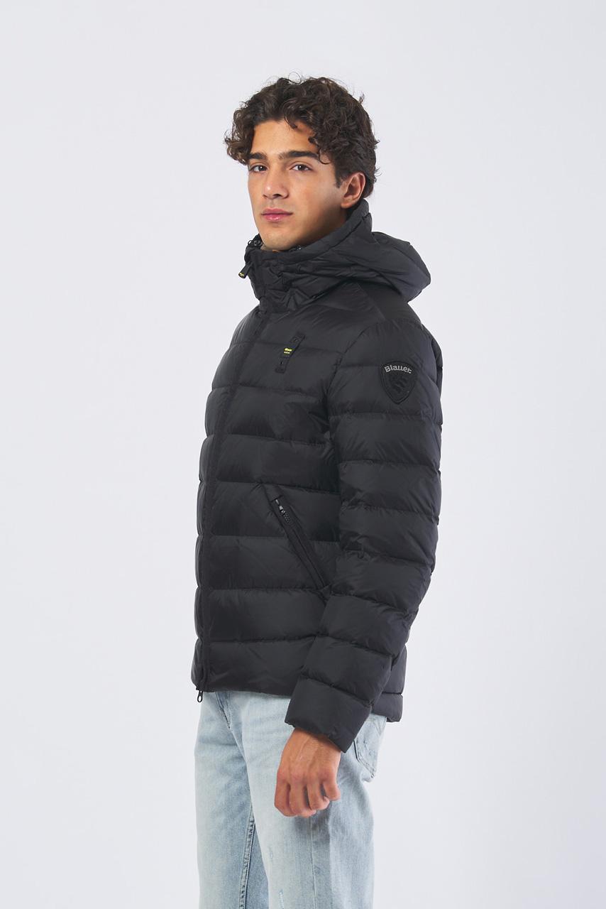 Piumino nero trapuntato a righe orizzontali. Capo iconico Blauer con imbottitura naturale in piuma, calda e non ingombrante.