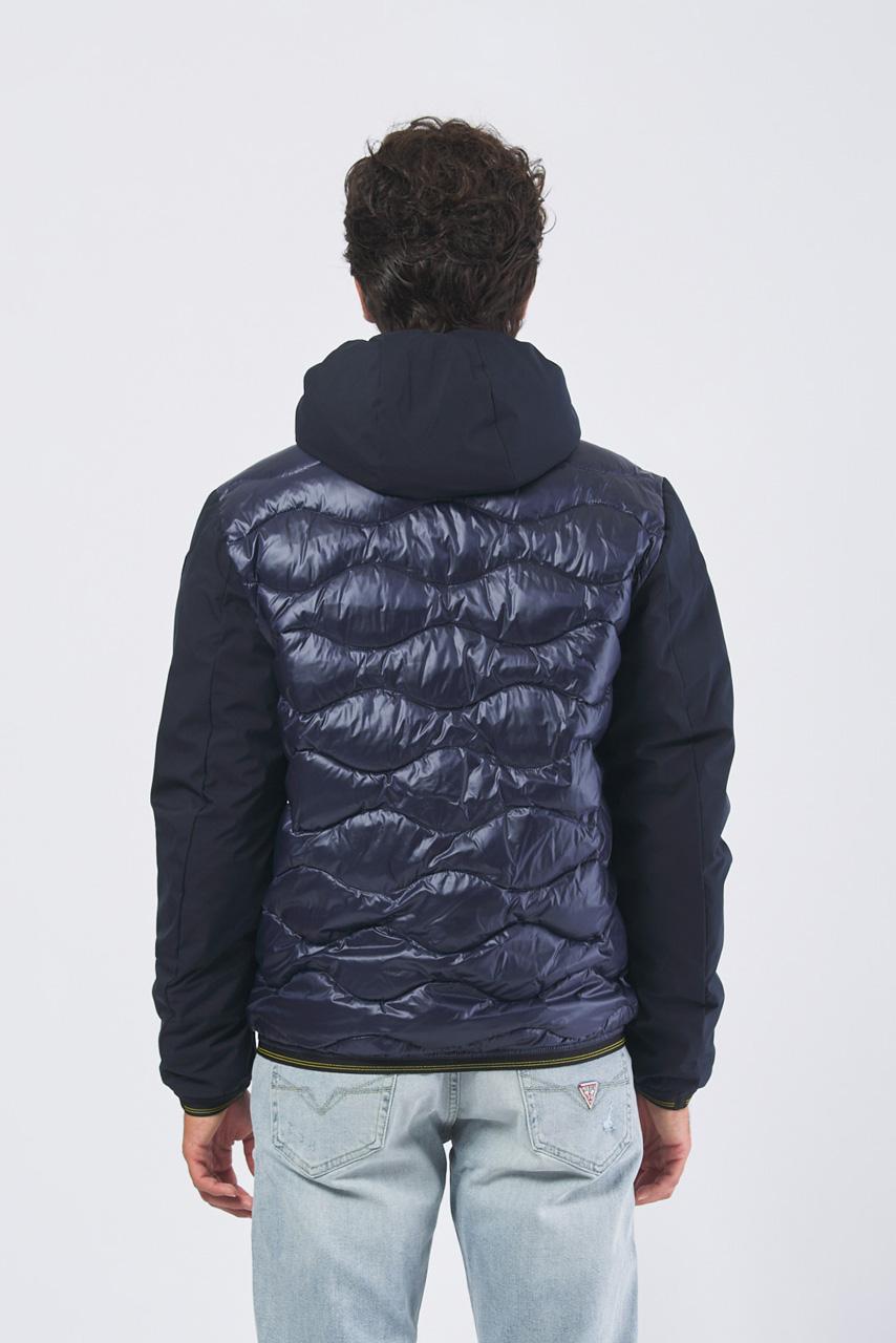 Piumino blu monocromatico in neoprene leggero e liscio sulle maniche e in nylon lucido impunturato ad onde sul corpo. Imbottitura mista.