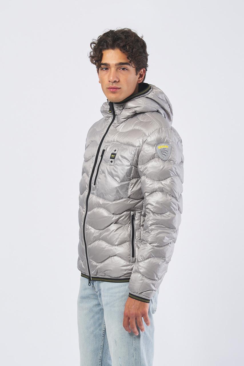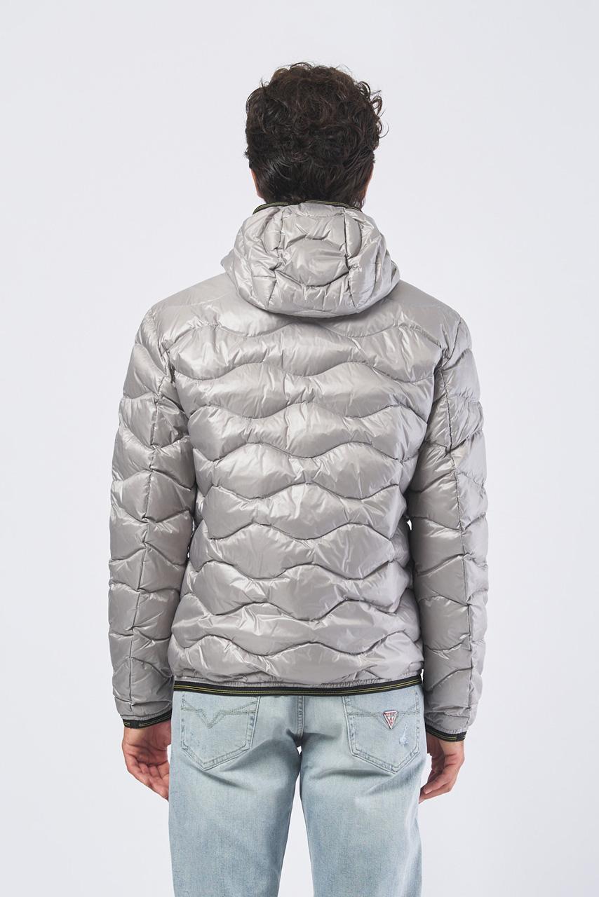 Piumino grigio trapuntato ad onde orizzontali. Taschina applicata sul petto a sinistra per donare al capo un tocco più funzionale. Imbottitura naturale in piuma, calda e non ingombrante.