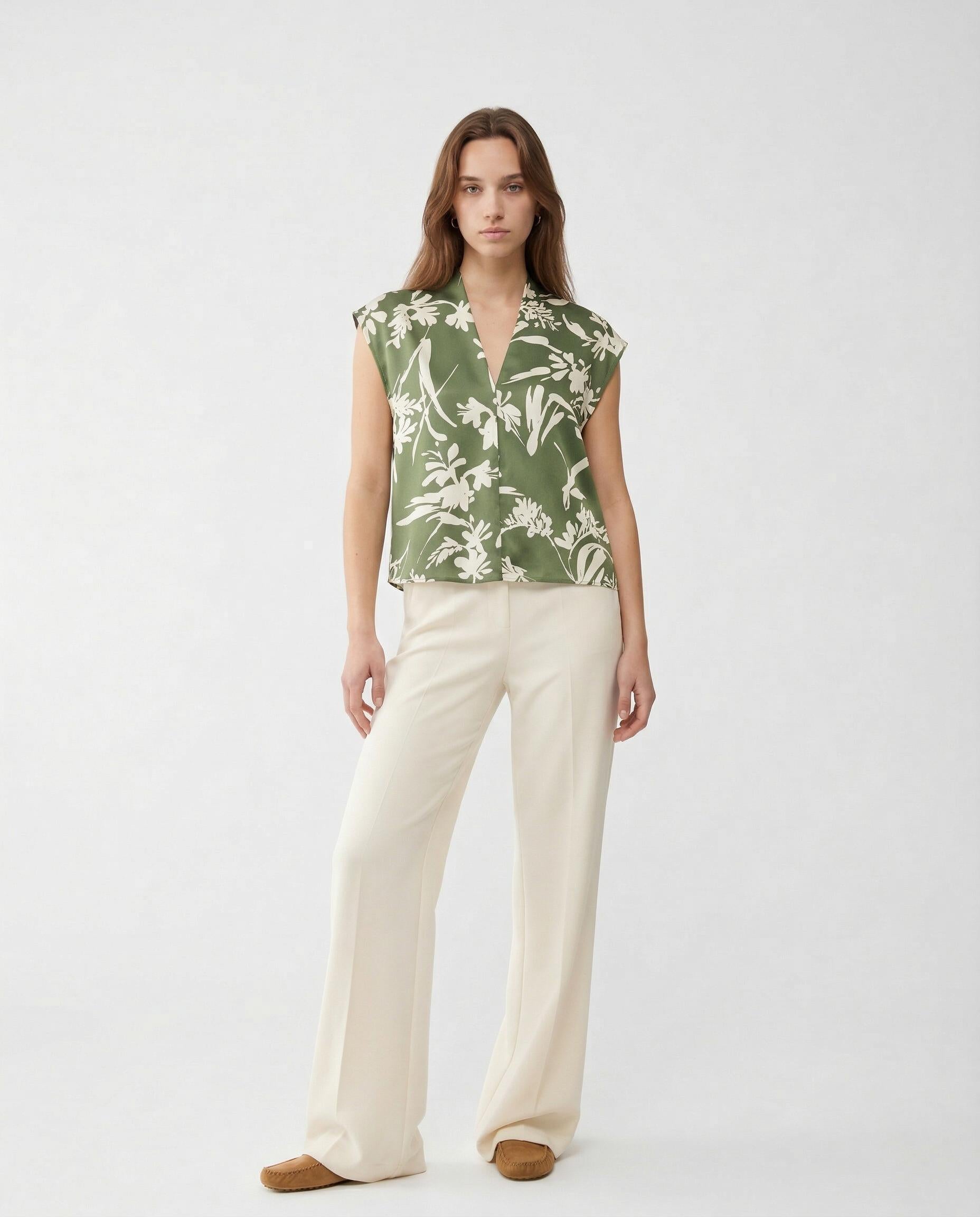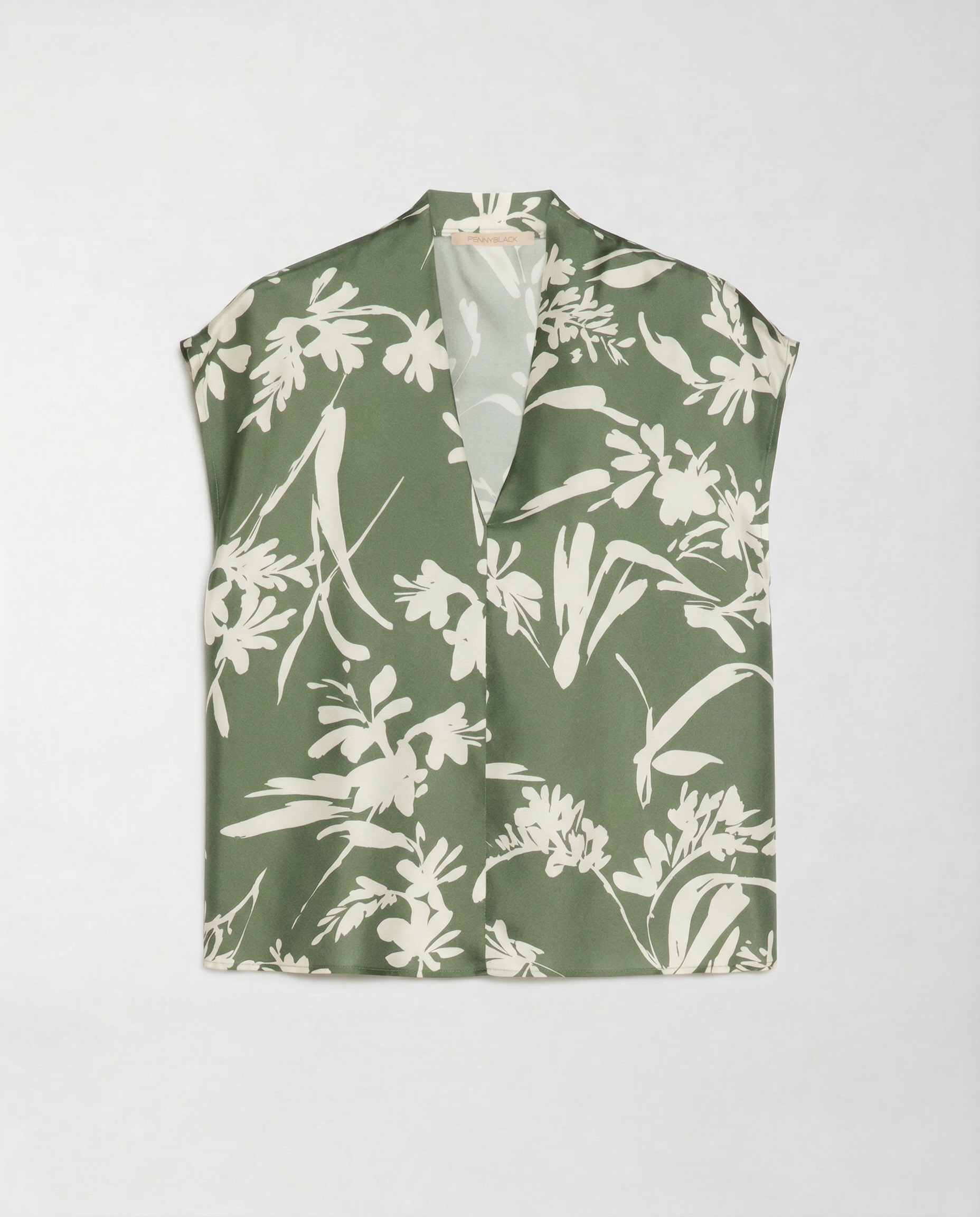L'intensa lucentezza del twill di seta distingue questa blusa, caratterizzata da una stampa floreale grafica su una base di colore solido. Perfetta per completare outfit eleganti, ma ideale anche per dare un tocco chic a look più informali. Il design presenta uno scollo a V sul davanti e un colletto alla coreana sul retro, con maniche corte a kimono che donano un'allure fluida e sofisticata.Composizione: 100% SetaVestibilità: RegularCodice: PBPAEROVIA - 002