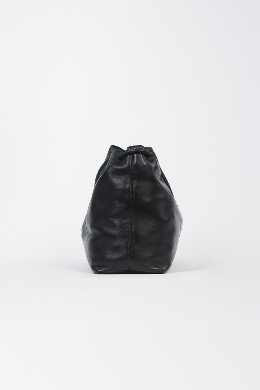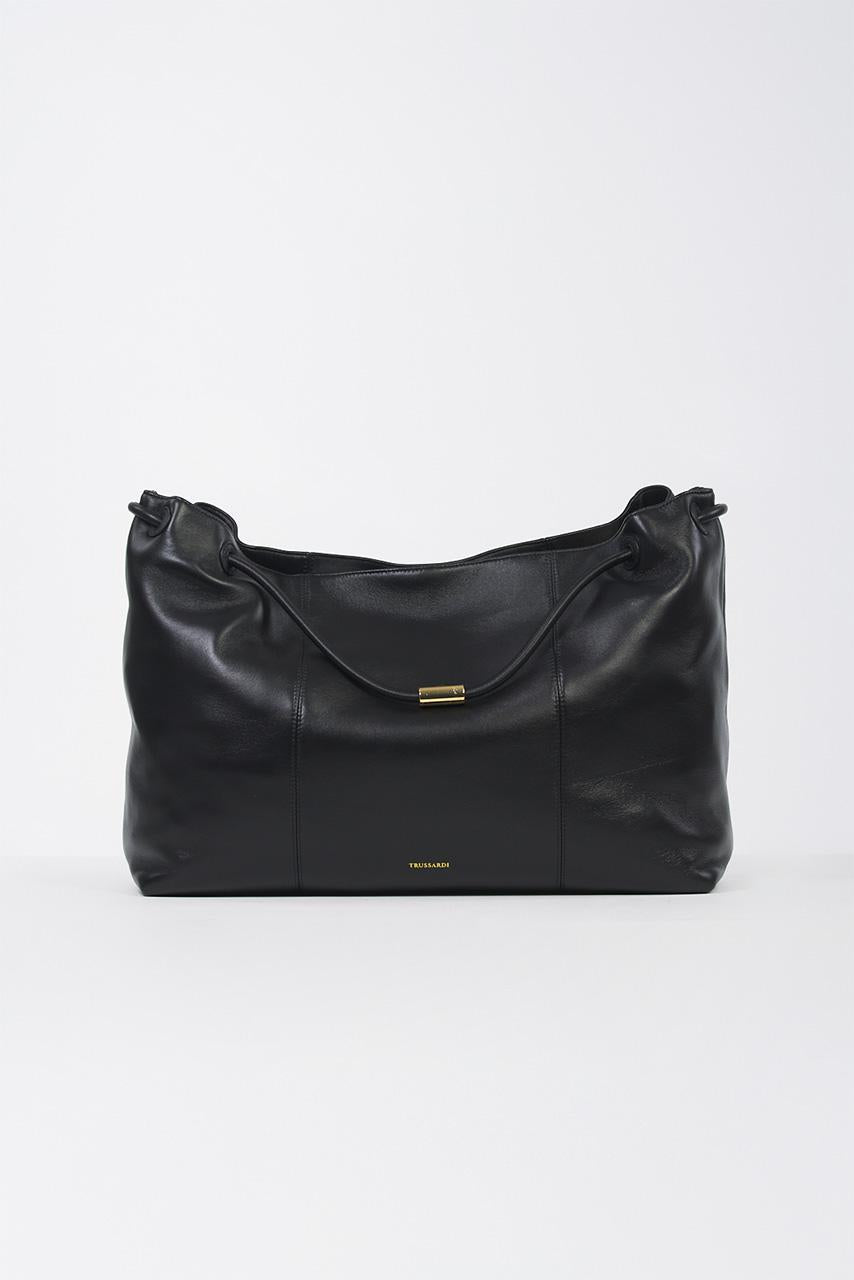 Borsa in nappa nera con tracolla rotante, elemento gioiello e scritta Trussardi.
