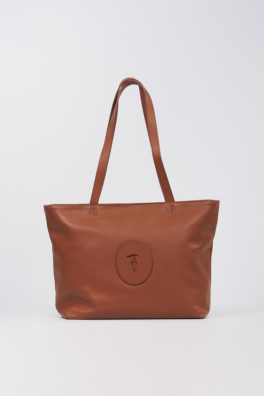 Borsa a spalla color brandy in vera pelle della linea Society. Chiusura a zip, tasca interna.